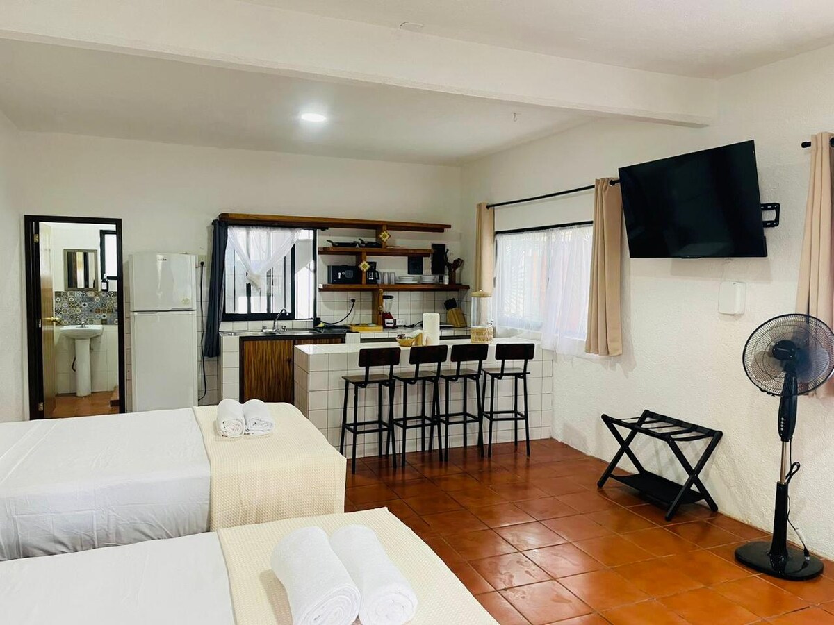 Cozy accommodation for two offers an unparalleled experience. With a comfortable queen-size bed, private bathroom, equipped kitchen, and terrace with barbecue, you'll find everything you need for a pleasant stay. Enjoy your own separate entrance and private parking. You will also have access to the hotel's refreshing swimming pool with bar, cafeteria, and social areas. Immerse yourself in the serenity of Puerto Escondido and make unforgettable memories at this beautiful retreat!