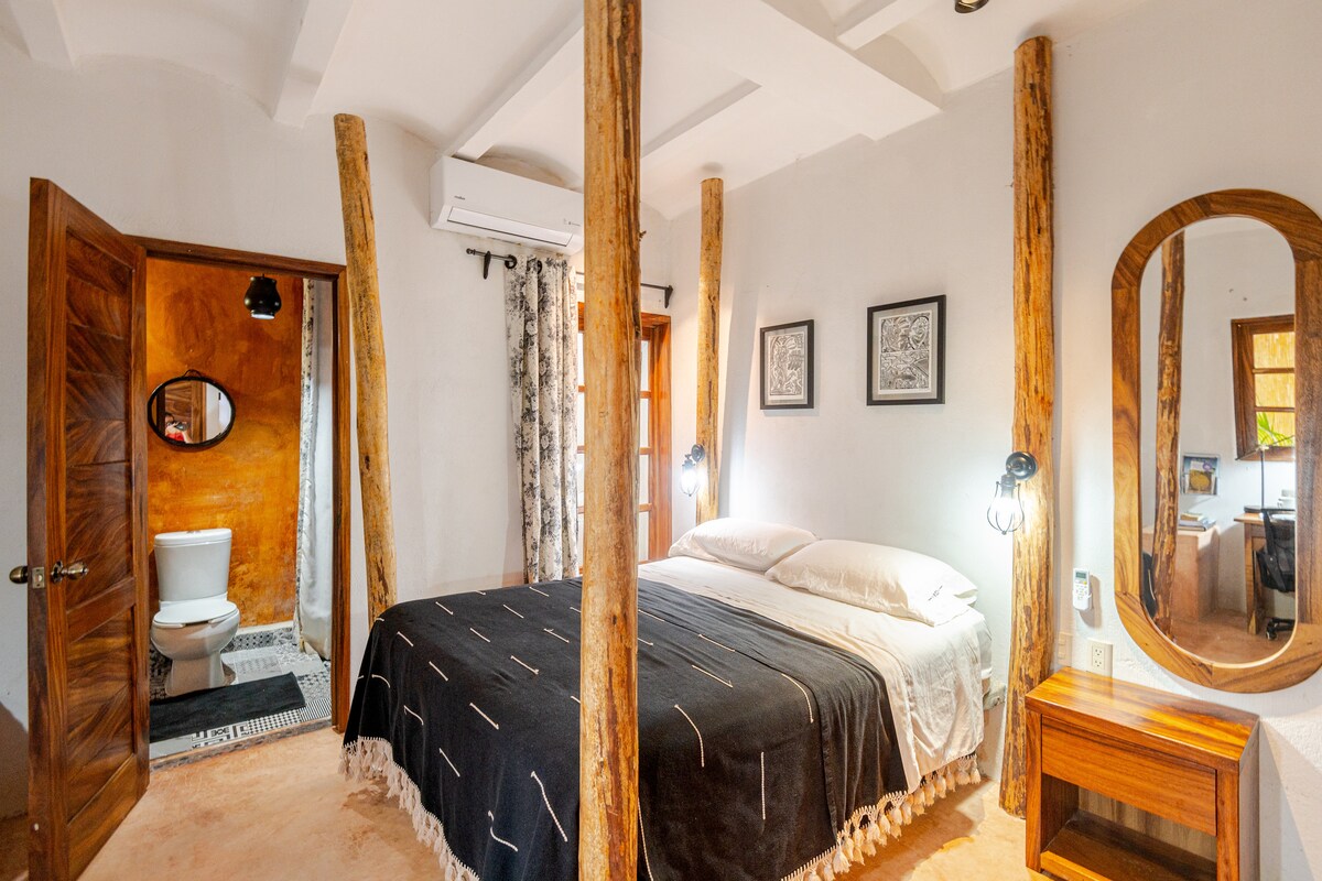Elegant suite with a queen size bed, Smart TV, air conditioning, ceiling fan, kitchen, bathroom and private Jacuzzi. Enjoy the sunsets and relax your mind while taking in the panoramic view of the city, ocean, and mountains from your private Jacuzzi. We are in Punta Zicatela, a 7-minute walk from the beach, the main surfing point, restaurants, bars and shopping area. Close to everything, but away from the hustle and bustle of the party. We have Starlink Internet.