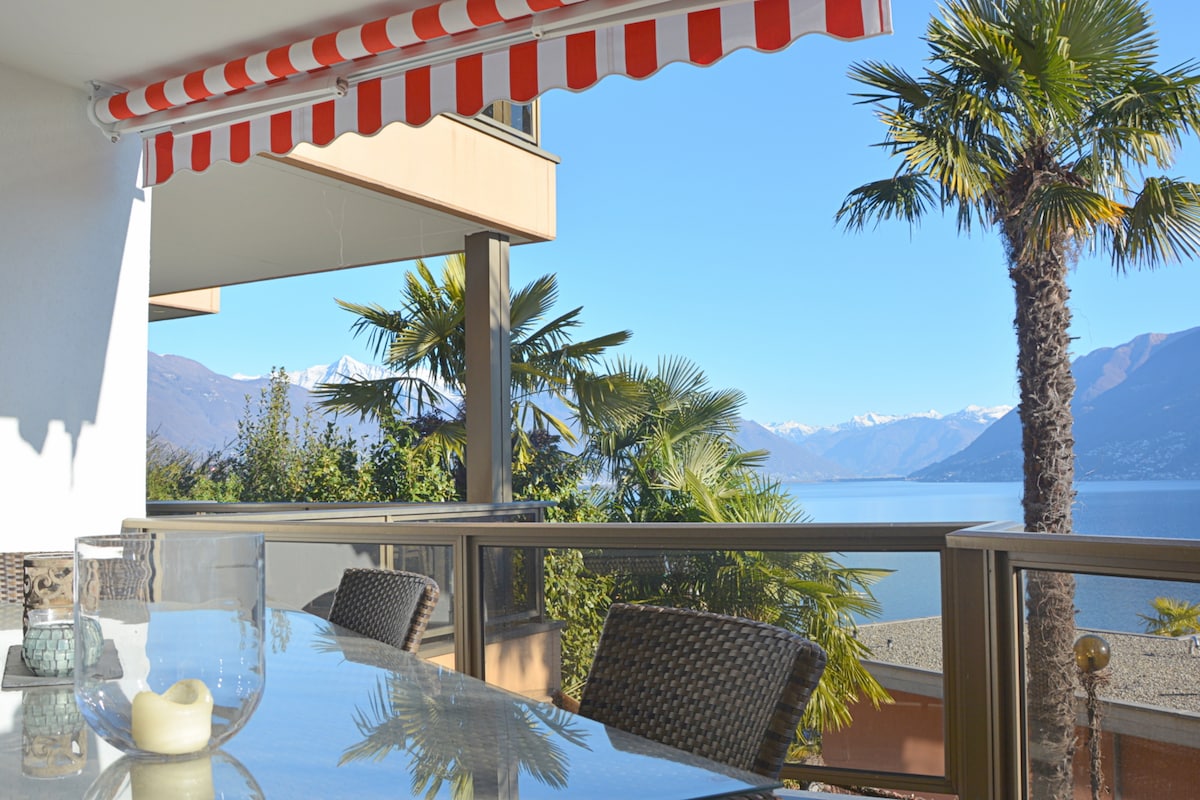 Breathtaking views, 20 m² panoramic terrace, 8 km from Locarno and Ascona: The 2018 lovingly renovated, high-quality furnished 30 m² romantic studio with enchanting Lake Maggiore views, organic bed and 4k TV is a fairytale box seat above the most postcard-worthy part of Lake Maggiore, a real gem, an oasis for two. A fairytale garden with camellias, palm trees, organic fruit and vegetables pampers you in addition to the lake view and invites you to self-service. Parking & WiFi.