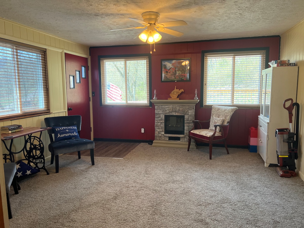 Cabin has a loft with a full & twin bed. There is a queen bed, full bath and kitchenette (microwave, coffee pot & mini fridge) on main level. Guests are welcome to use outside kitchen which has full fridge, gas, charcoal & flat top grill. There is also tables and outside shower on 15x40’ deck. The fire pit is great on those chilly mountain evenings. 10-20 mins. to historical Belpre, Marietta OH & Parkersburg WVA. Note: There is cell service in cabin but NO wifi. TV is antenna only.