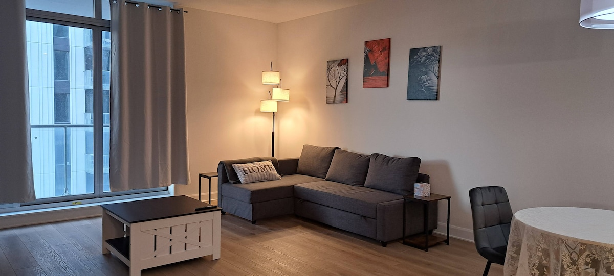 Enjoy your stay in the heart of the city ! Brand new TDC 2 downtown luxury with direct Bell Center access! Revel in comfort in our fully furnished and equipped one-bedroom condo with own private balcony! Your stay includes access to a sauna, pool, gym, skylounge, gaming room, lounge, and terrace with multiple barbecues. Free underground parking, with the subway just minutes away. Without stepping outside, the city is yours to explore. Plus, unwind with complimentary Netflix for the perfect stay