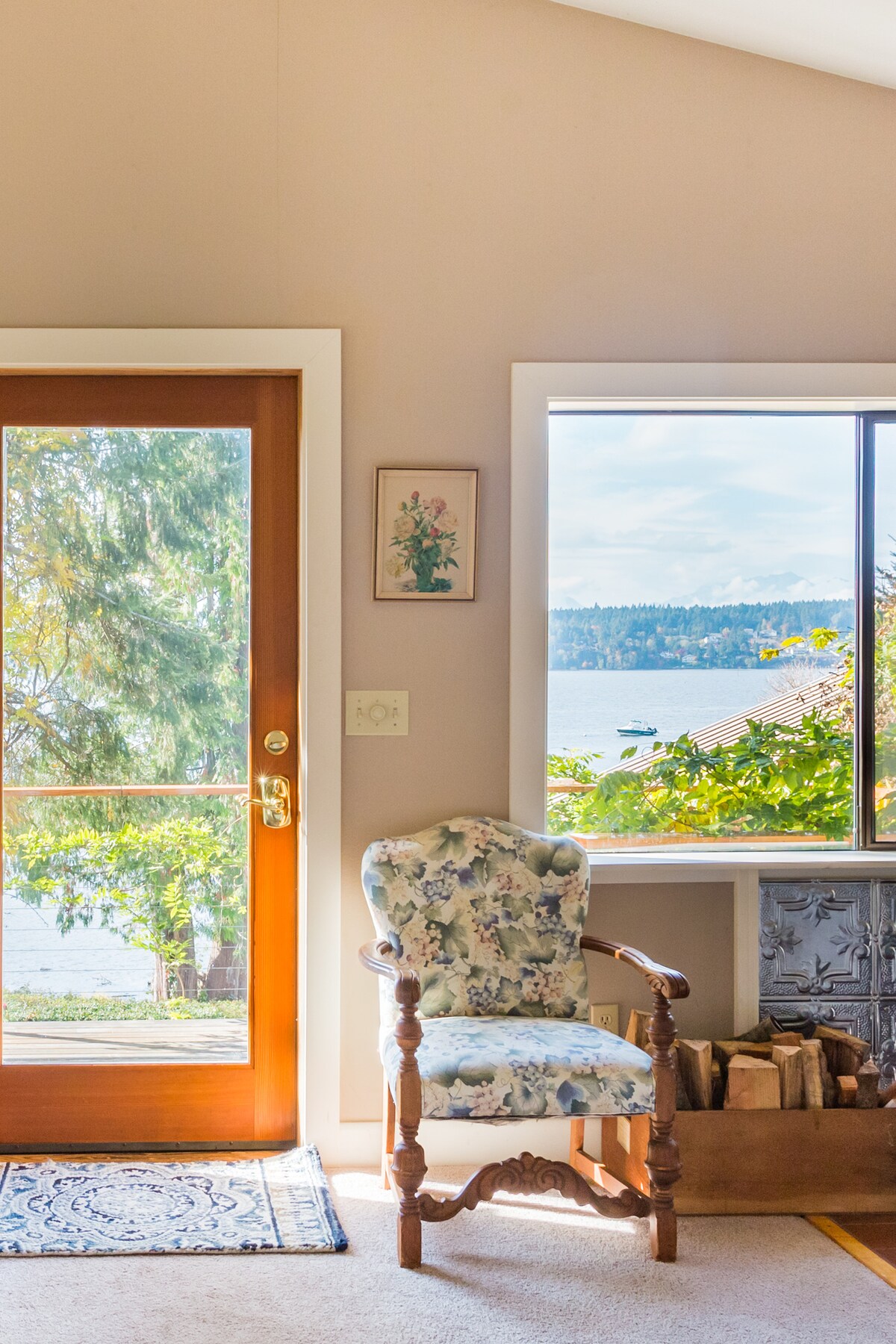 Spend lazy days on the deck as boats, seals, and herons pass by, or watch a film by the light of the wood-burning stove. Flowers, ferns, and a sparkling Tiffany lampshade add to the fresh vintage charm of this tranquil retreat with a pretty garden. The cottage features great western views of the mountains and water with spectacular sunsets, passing boats and wildlife watching. Large windows and high ceilings create a light filled space that is both cozy and inviting. P-000102