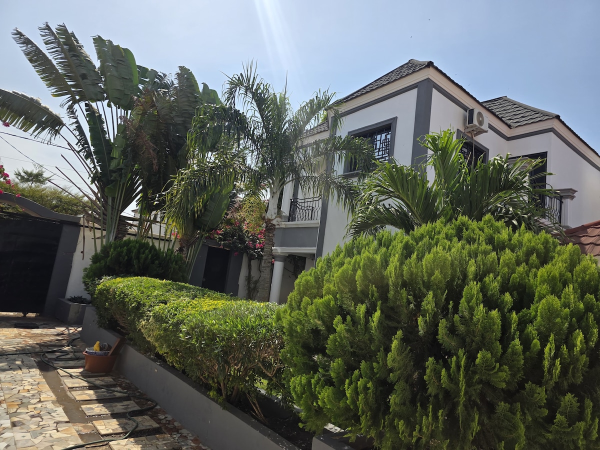 A full compound for rent! This is a 3-bedroom bungalow on a massive plot for your perfect holiday in the gambia! Fully furnished and well located in Bijilo. The living room is well designed and comes with a 65 inch TV. The living room is connected to the dining area and the fully equipped open kitchen. The master bedroom has an ensuit toilet + shower with water heater. There are 2 more bedrooms and another bathroom