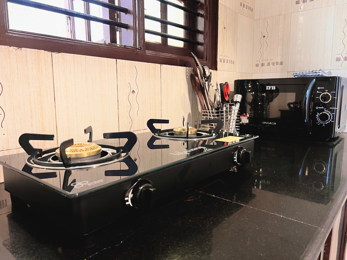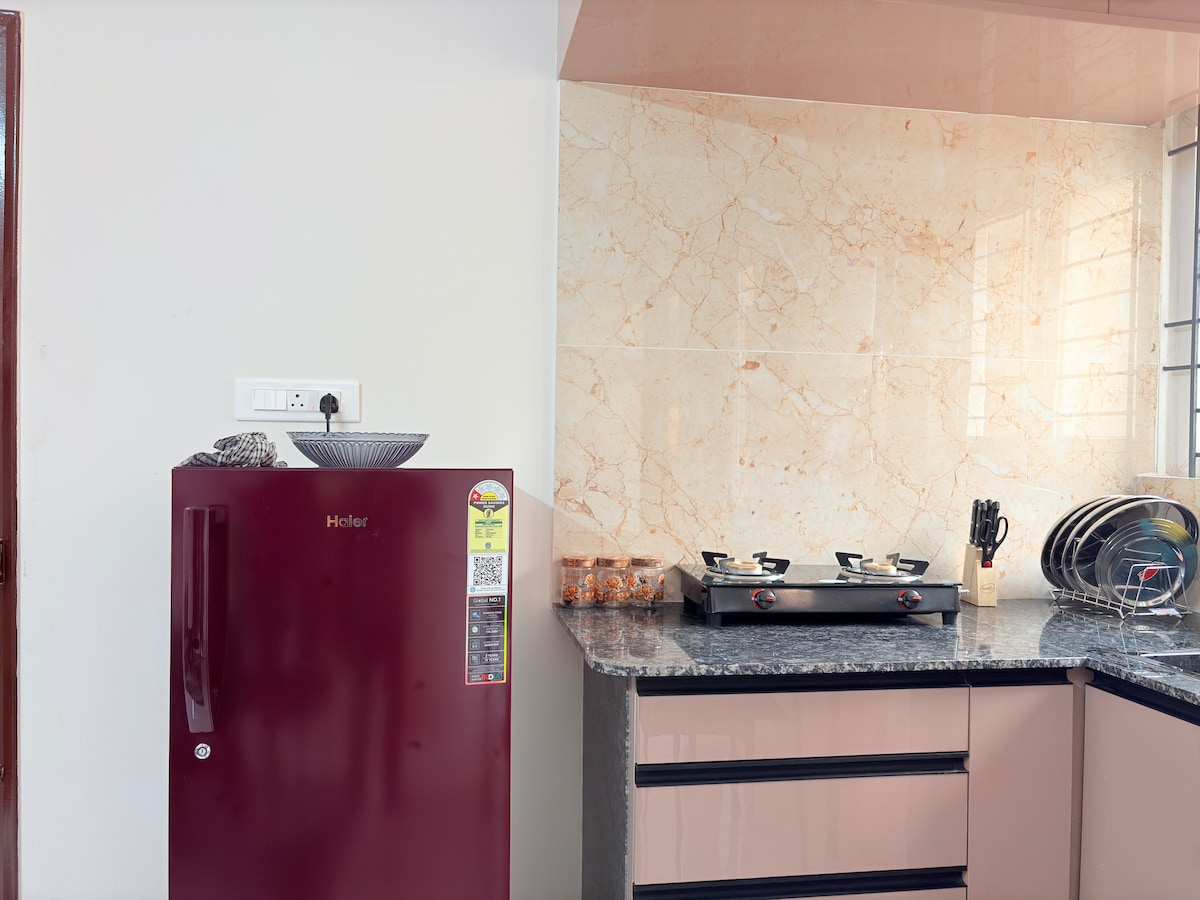 Welcome to our brand new, spacious 1-BHK flat, ideal for couples and families seeking comfort and convenience. The bedroom boasts a queen bed and soft orthopedic mattress for a restful night's sleep. Relax in the large living room with a 43-inch Smart TV, lightning-fast WiFi and dedicated workspace. Comes with a super clean bathroom stocked with essentials. The fully equipped kitchen includes basic ingredients, high-quality appliances, and crockery for your culinary adventures.