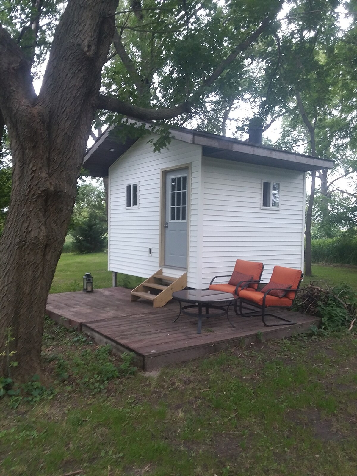 One room cabin in my backyard. The couch folds out to a bed. Comes with an electric heater and air conditioner. The shared bathroom is located 100 ft away in the basement of the house. Bathroom was added July 2021