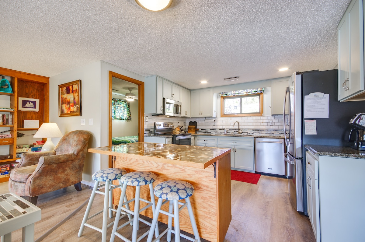 Why stay in the city to work from home when you can stay at the lake and work from home! Need to work from home? This is it. Extended stay discounts available. Beautiful views. 2 bedroom cottage with access to many of the areas best bars and restaurants. Large covered deck. Private dock. This is a perfect spot to spend time at the lake. Enjoy streaming services with ROKU. Fido is welcome too ($30 fee with pre-approval). Dogs MUST be flea & tick treated. Special military rate available.