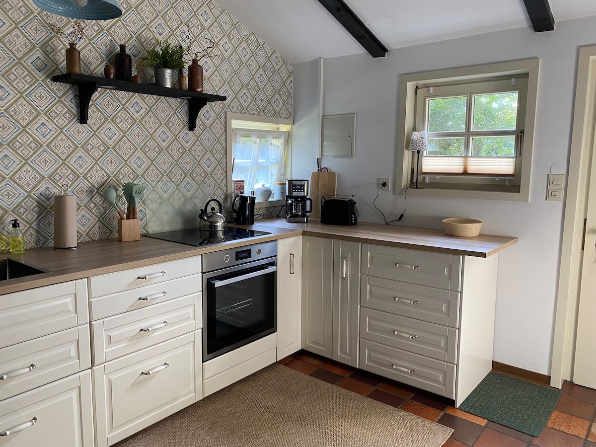 Our lovingly furnished bakery offers everything for a relaxing break in a rural area. A modern bathroom with shower, a fully equipped kitchen, a bright living area with a large sofa, TV and dining table and a cozy bedroom under the roof await you. A parking space under the apple tree is available. The quiet location overlooking meadows and fields invites you to relax. Perfect for nature lovers, cyclists and anyone wanting to get away from it all.