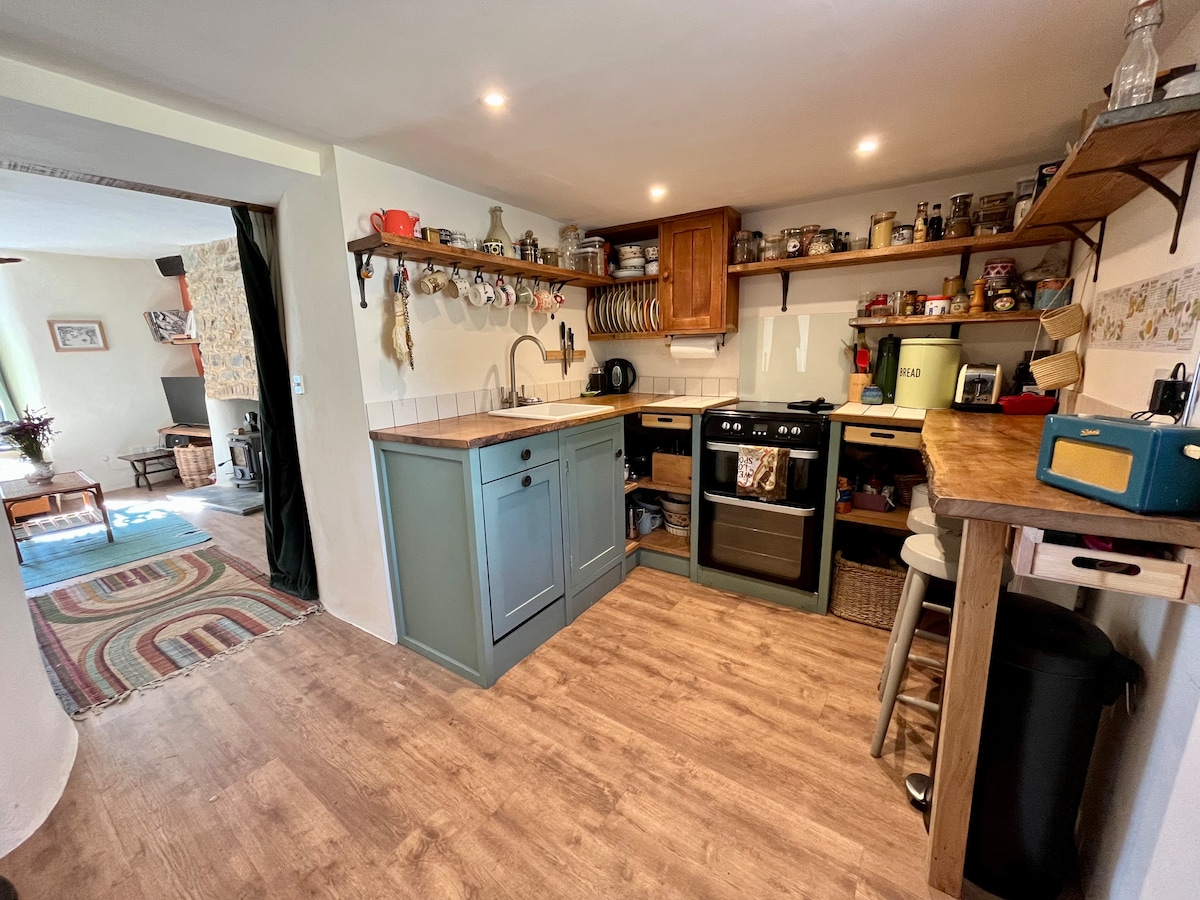 This quaint detached barn is full of character and peace (no WIFI). There is an open plan kitchen/living area with a cosy log burner ( logs available at £7 cash a net) and a slate topped breakfast bar. The property has solid oak flooring throughout except for slate in the bathroom so don’t forget your slippers! The kitchen includes an oven, hob, fridge-freezer, toaster, microwave and kettle. The cosy sitting area opens out onto an attractive patio and grassy area. Sorry no pets
