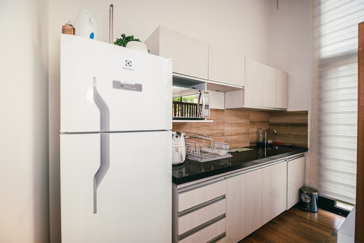 Host your family in the fantastic place with many areas to have fun. There will be incredible memories in this comfortable place either with A/C or the natural freshness of the house in the middle of the large garden with ornamental, fruit, floral plants that shelter and feed birds, squirrels, butterflies and Angels! Here you can prepare breakfast, snacks, lunch, grill, afternoon snacks, dinner, juices, sandwiches, scrambled eggs, omelets, etc.! In an ecotourism village with local and international restaurants.