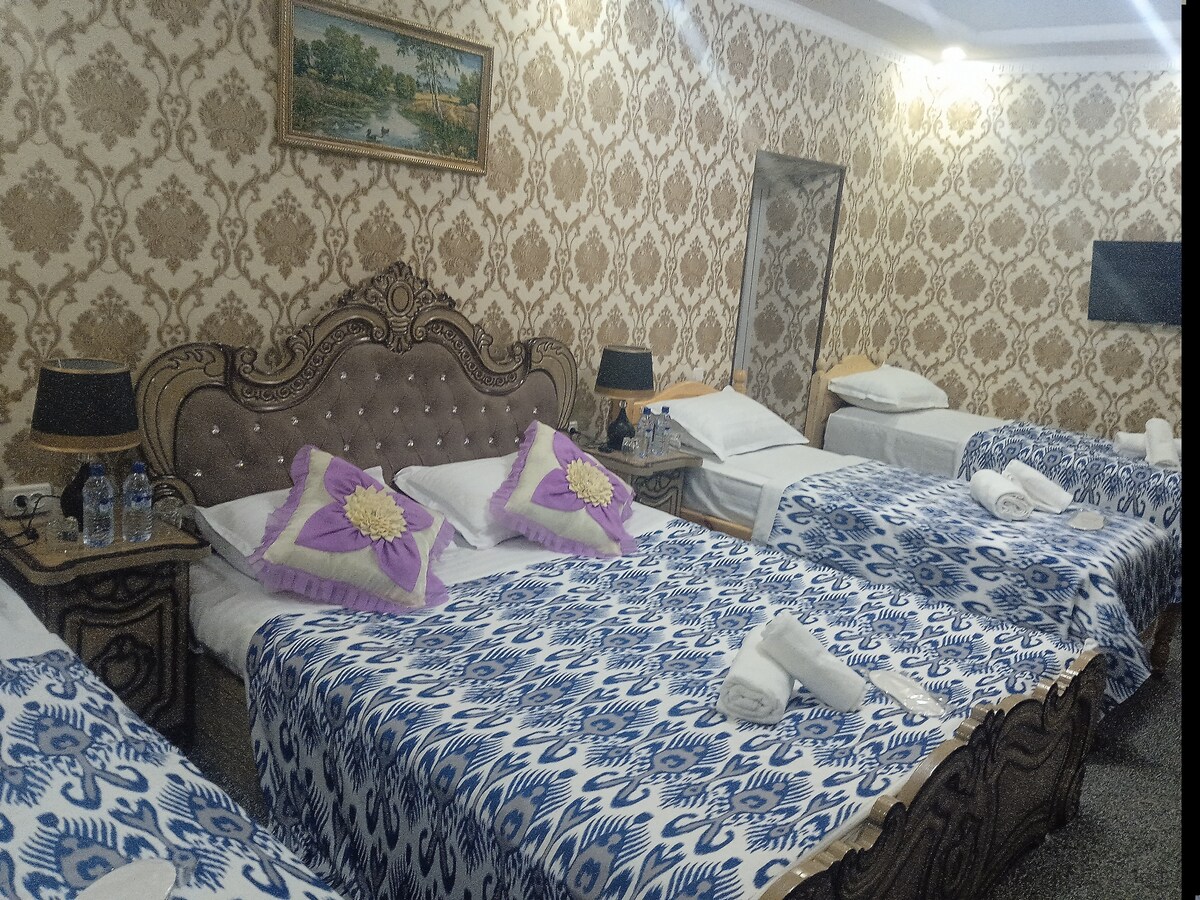 Quiet Accommodation in the Center of a Tourism Destination. Close to the main attractions such as: Zindan (19th century), Ark Fortress, Kalon Minaret, Miri Arab Madrasah and other 30 historical sites. Due to the fact that the object is close to the ancient sites, you do not need to spend hours getting to them by taxi or on foot, wasting time and money The room has its own inside bathroom with toiletries, a wardrobe, comfortable beds with orthopedic mattresses and convenient lockers.
