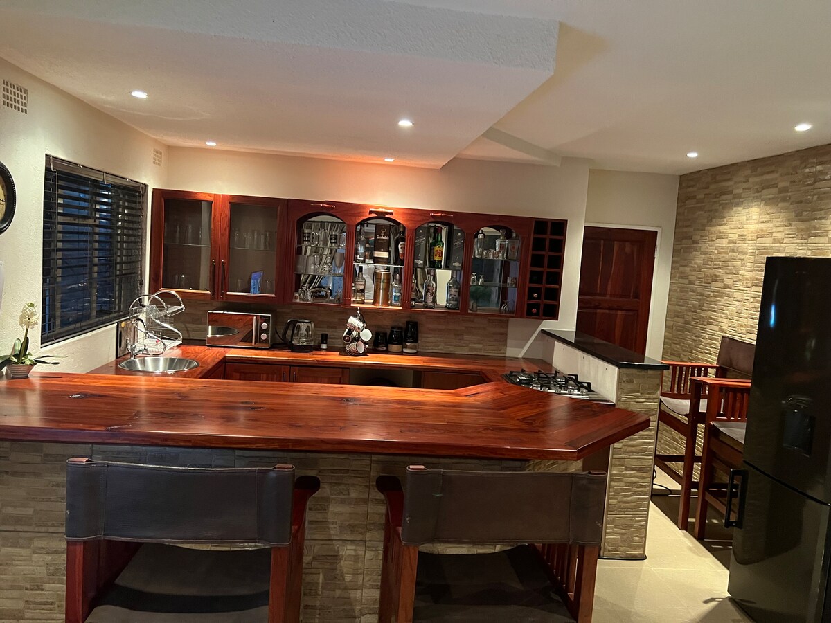 This unique place has a style of its own. Enjoy your stay in this compact studio apartment designed for sleeping, eating & dining. The kitchenette is fully equipped with a gas hob, mini fridge, & microwave. There is a separate bathroom with a shower. TV with DSTV (cable TV) is available, as well as wifi access. For backup electricity, there is a solar system The studio apartment is attached to the main house, with its own outside entrance, & parking on site.