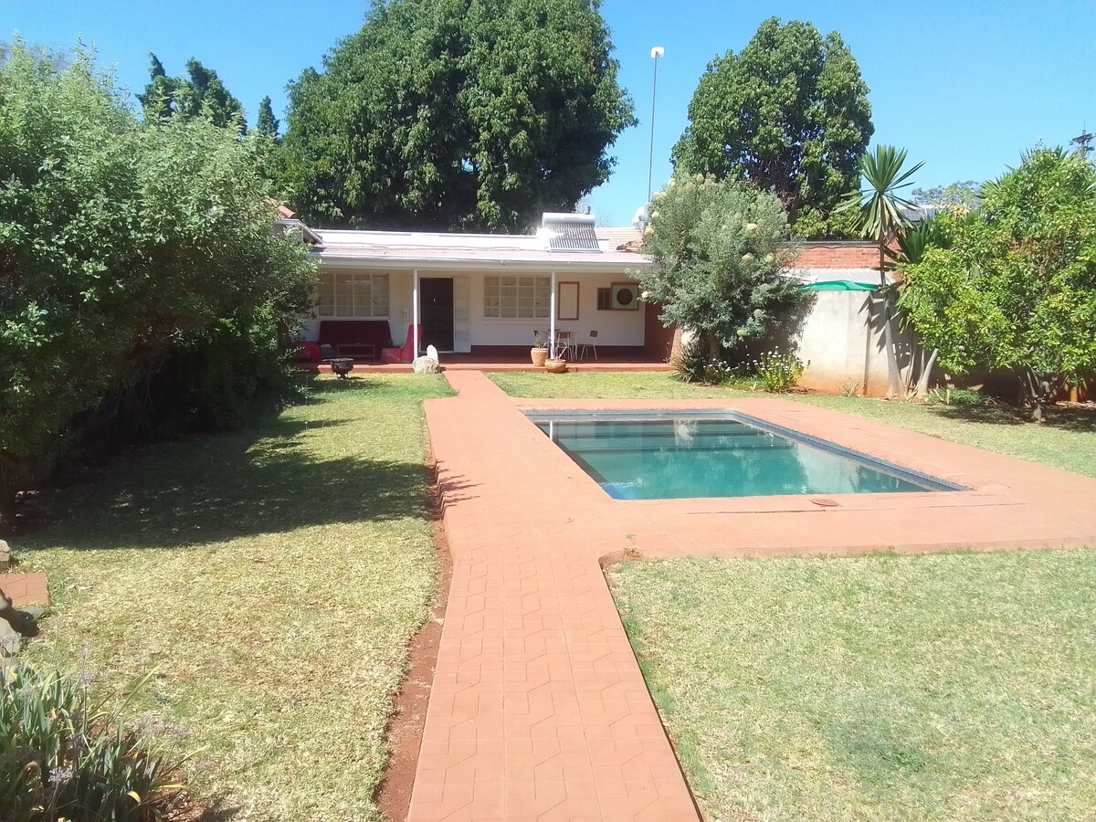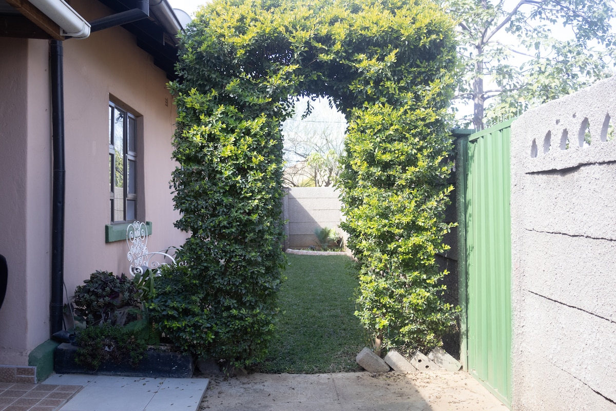 Bulawayo's best spot is super close to town and has a lush garden and secure living area. You’ll love my place because of the outdoors space. Highly recommended for couples, solo adventurers, business travelers, and families (with kids). Equippped with solar lights and geyser, in the event of power cuts as well as a gas stove.