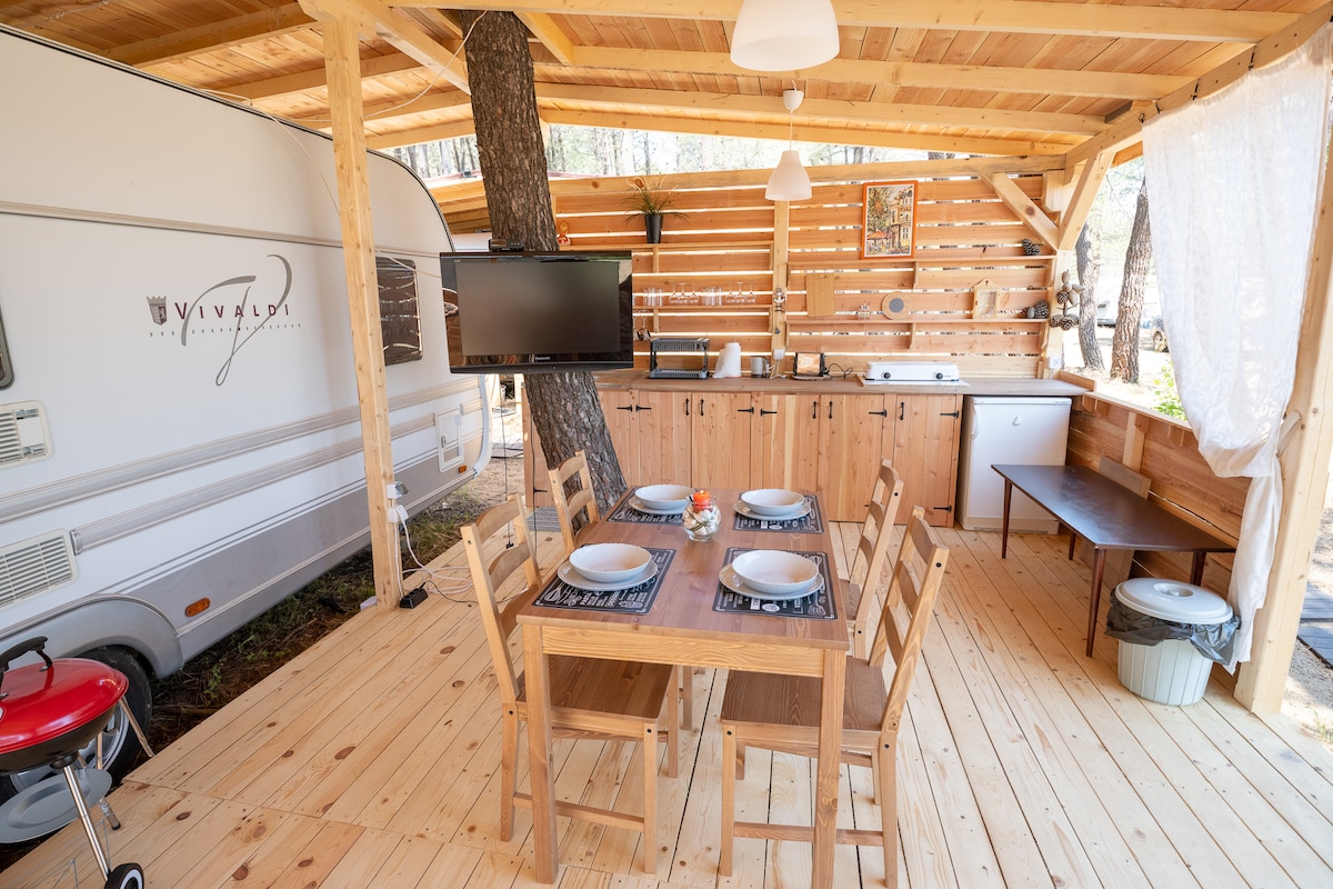 Enjoy a vacation of full immersion with nature.. nestled in between the pine trees and hidden behind the sand dunes of the beautiful Gradina Beach in Sozopol.. the Caravan is equipped with everything you need for your comfort and luxurious holiday at the beach.. because waking up with the song of birds at just a few steps away from a morning dip in the blue sea is the biggest and the most rare luxury nowadays.. **Yoga Camp on site Message us for info and details ;) Xoxo