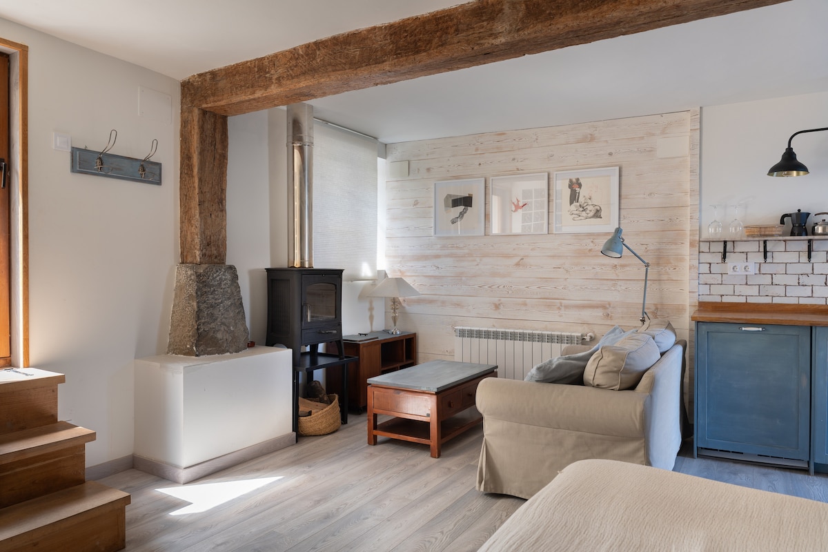Sustainable rural studio for 2 people in the Ulle Gorri Rural House, located in a privileged environment in the Mar de Prados del Gorbeia and near the Salto del Nervión and the Gujuli Waterfall. European Ecolabel for Environmental Sustainability. Optional extra bed Large windows with access to the garden, with outdoor furniture. Hiking activities, bird watching, Nordic Walking courses and outings, gastronomic experiences.