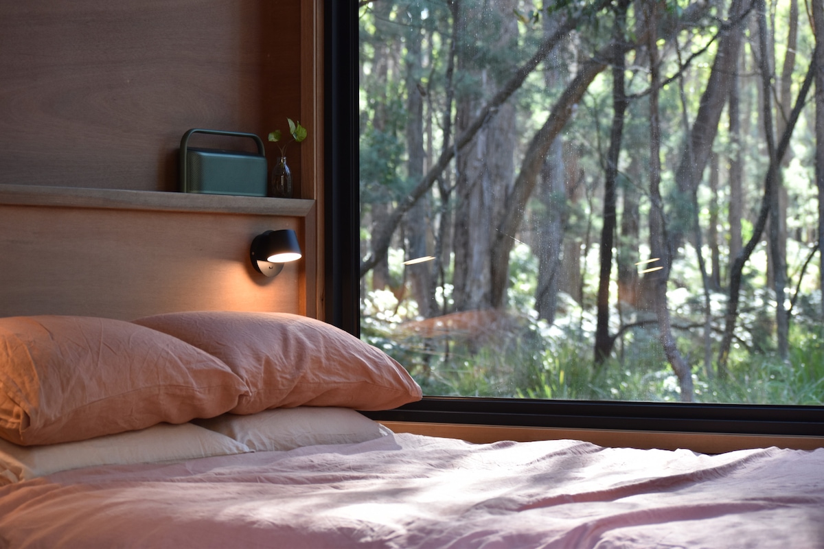 A secluded and intimate luxury escape inspired by the need to live smaller and more sustainably, Monterey is an eco-friendly off-grid tiny house nestled amongst 35 acres of native forest offering guests the perfect opportunity to explore nature, unwind and recharge. Built from salvaged Monterey Cypress timber, the house offers a dreamy king sized bed downstairs with floor to ceiling windows. Explore the surrounding forest and wildflowers and immerse yourself in the sounds of nature.