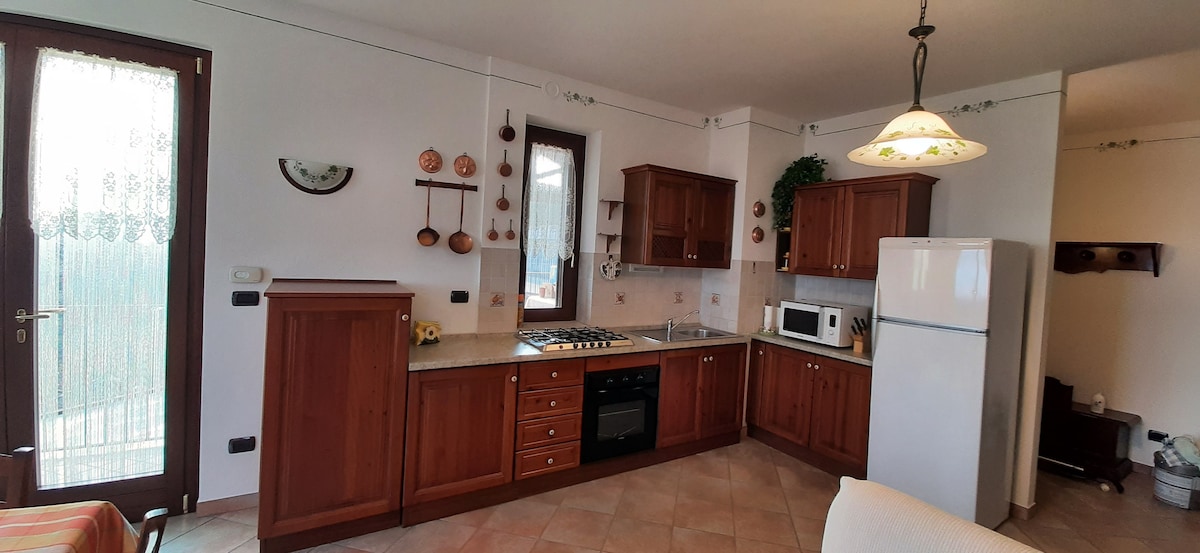 CIR00403400010 Portion of house with independent access consisting of large living room with kitchen complete with microwave, oven and kettle, double bedroom and an additional room with two single beds (crib on request). Bathroom with shower and washing machine. The house is located at the foot of Busca hill, in a quiet location surrounded by greenery, a stone's throw from hiking trails. From the terrace you can enjoy a breathtaking view of the surrounding areas.