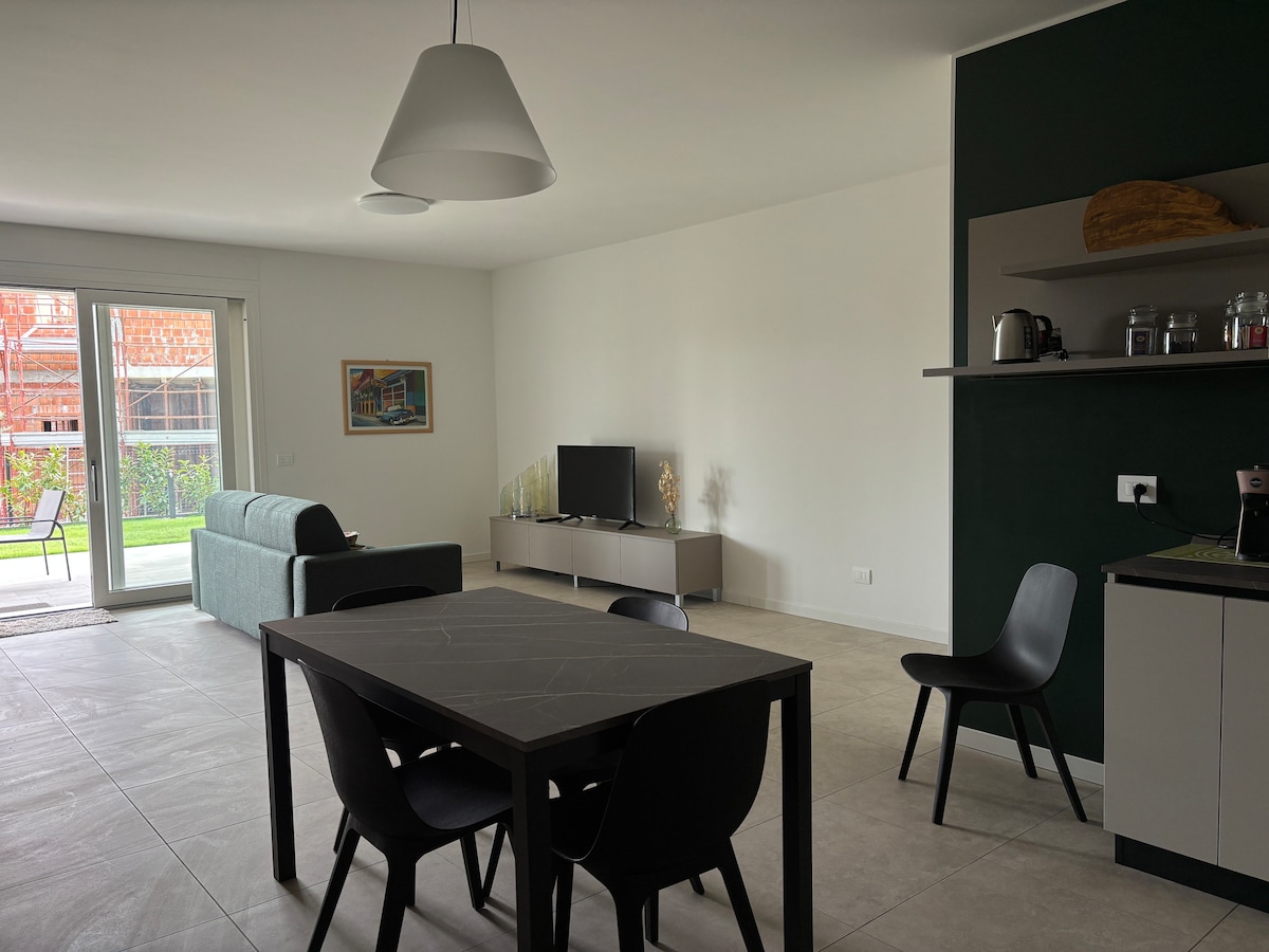 Relax with the whole family in this quiet accommodation. The ideal apartment for 2 adults or 4 people (if there are two children sleeping on the sofa bed in the living room) where you can relax, and experience Lake Garda which is 10 minutes away or Verona 15 minutes away. We are a few meters from the municipal swimming pool, tennis courts and playgrounds for children. 800 meters from the center of Bussolengo (VR). We are on the ground floor with a garden and porch with outdoor seating.