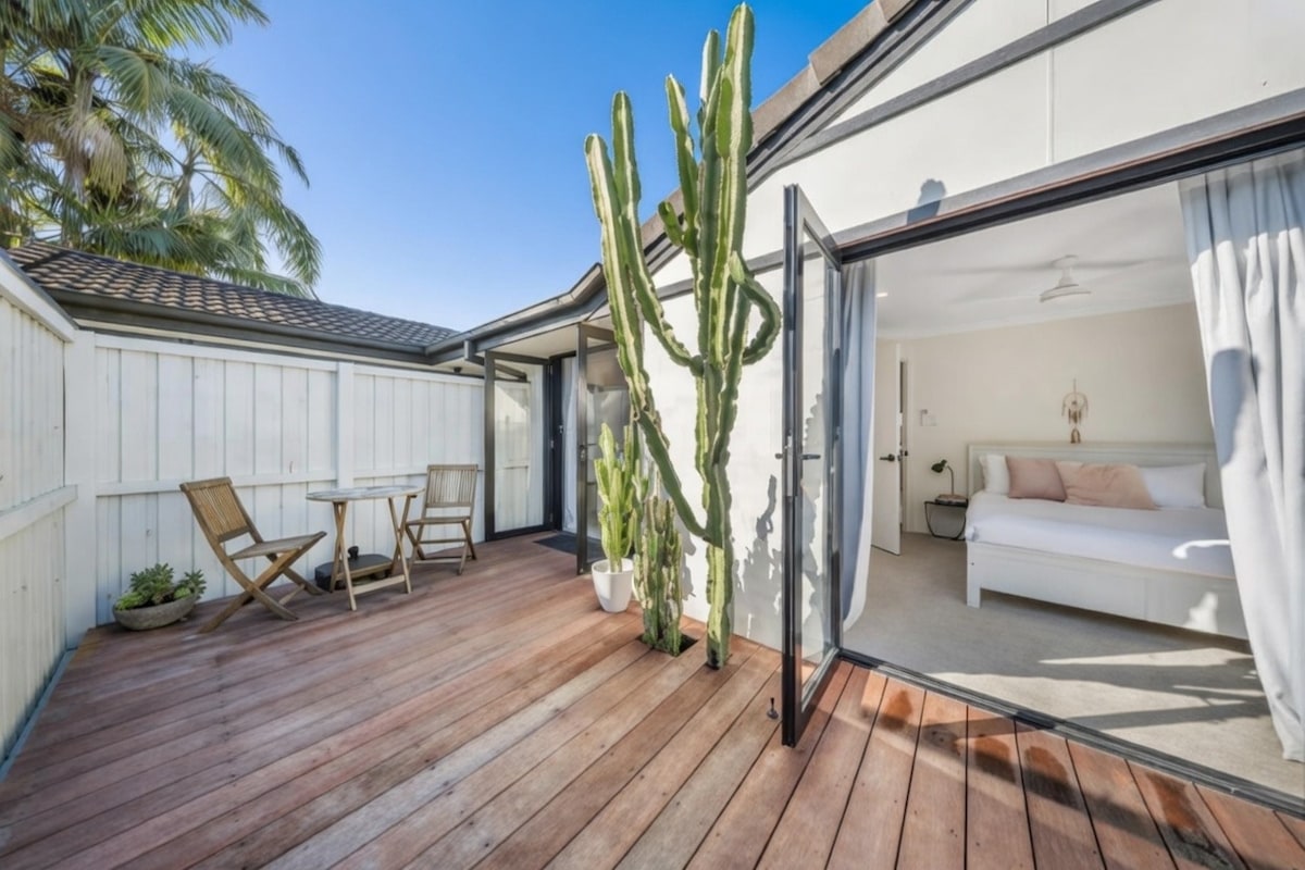 This recently renovated, stunning guesthouse with private decked area is only moments away from the centre of Byron Bay and its spectacular beaches. Only a 3 minute walk to town and a 10 minute walk to the closest beach! Coco Byron is the perfect location and space for your next Byron Bay getaway. This section of the property is part of a large home. We have divided the property into smaller sections via lockable adjoining doors. You have your own private entrance into this guesthouse.