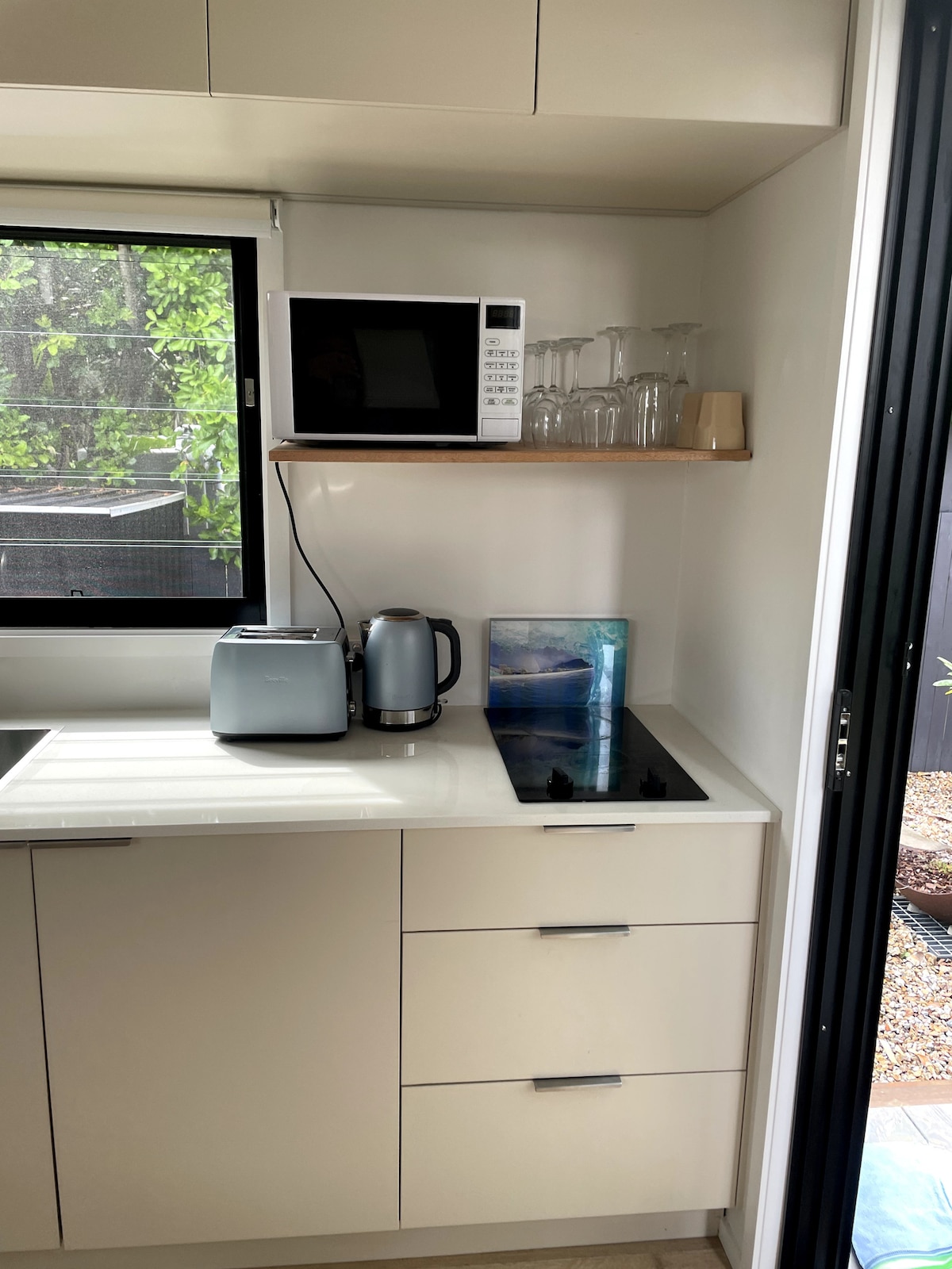 Modern new studio opposite Belongil Beach with a short 10 minute walk to town and a 3 minute walk to the famous Treehouse restaurant and bar. The studio has a separate entrance from the main house. The kitchen has a full fridge, hot plate, microwave ( located in cupboard above the fridge) and air fryer. There is mini weber bbq for guest use. This cabin has everything you need for a lovely seaside break including aircon and a fan.
