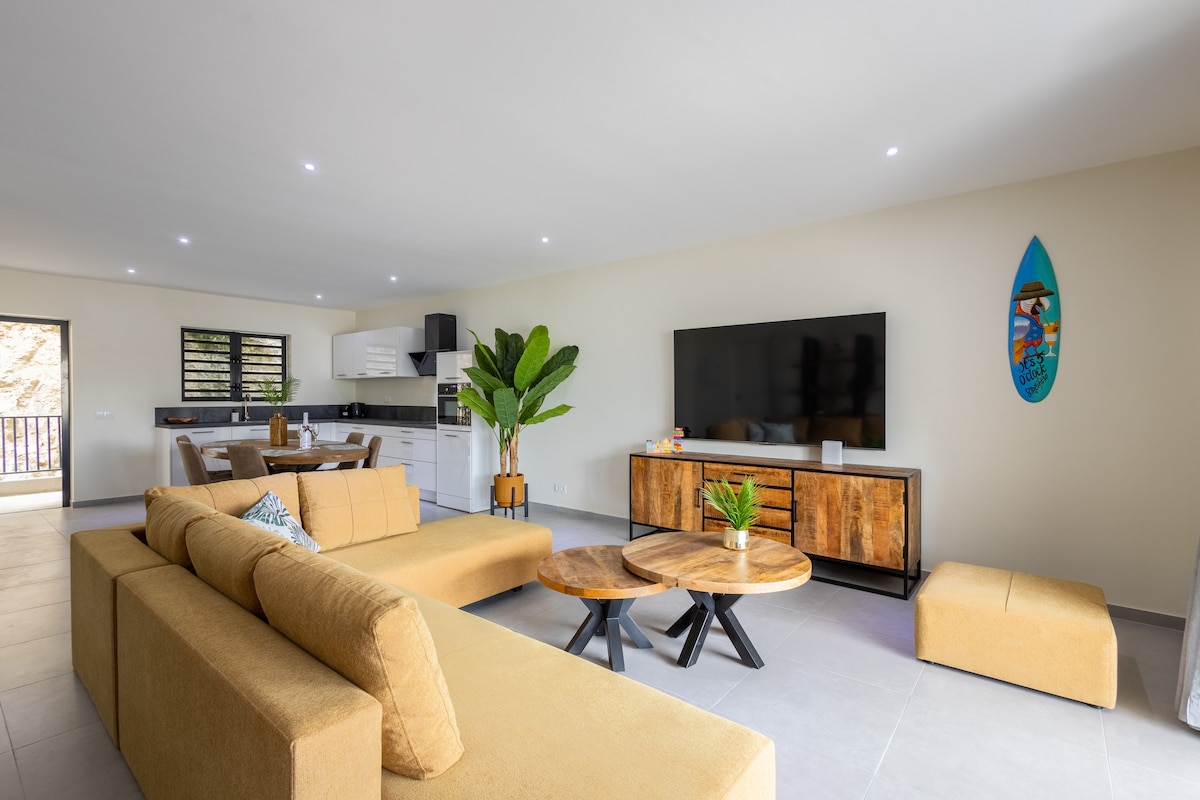 Luxury holiday home at the secure La Privada resort, within walking distance of the famous Mambo Beach. Here, you can enjoy the expansive beach, numerous restaurants, bars, dive and snorkel spots, and stunning beach clubs without the hassle. The house is located in a 24/7 guarded resort, allowing children to play safely outside, and a large communal pool is just a one-minute walk away. The house features a large balcony with a lovely view, where you can also see the road to Mambo Beach.