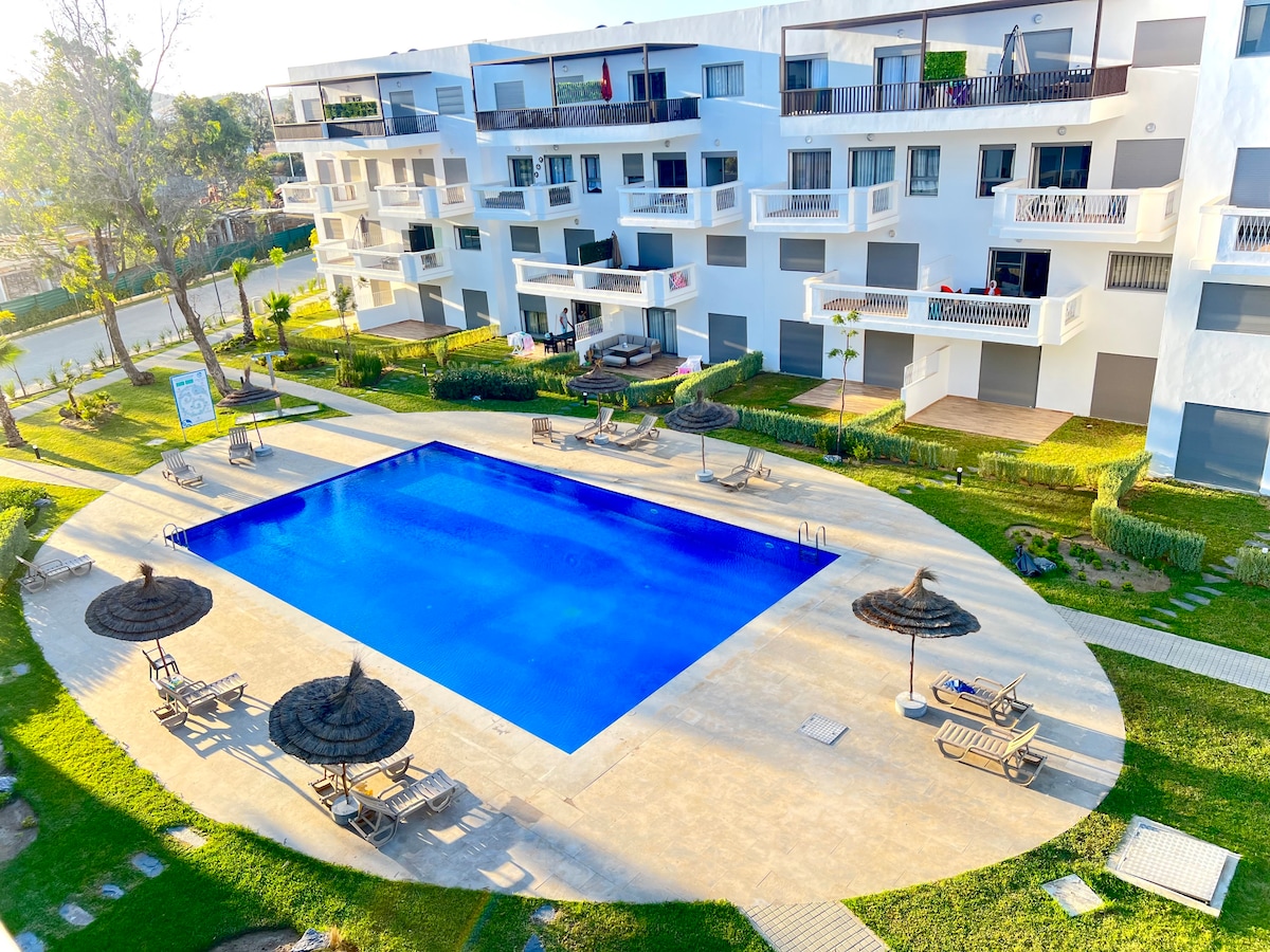 Nice new apartment in a secure private residence with 3 swimming pools, a children's play area, free parking on site and 5 minutes from the beach. The apartment consists of 1 bedroom with bathroom, a living room, a dining room, a well-equipped kitchen, a shower room and a large well-equipped terrace. Close to all amenities (Café, restaurant, pharmacy and supermarket), the apartment is 10 minutes from Martil and M'diq.