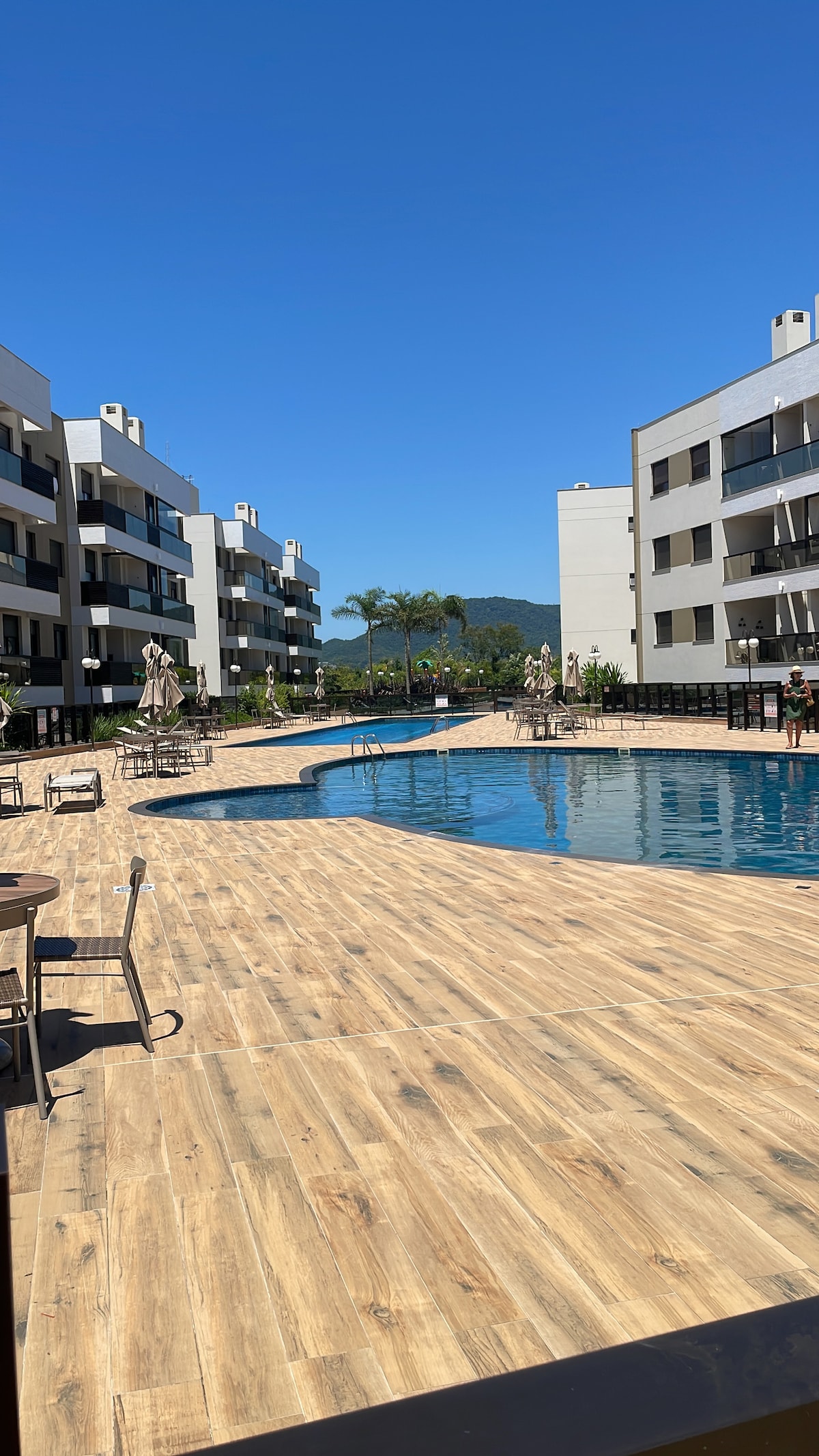 Lovely apartment, furnished, in the best condominium with Pool of the South of the Country - Marine Home Resort 1 bedroom with suite with 1 double bed and 1 single bed, 1 bathroom, kitchen, living room two rooms, service area, balcony with barbecue. In the living room there is 1 super comfortable sofa bed and an inflatable mattress AIR-CONDITIONED ROOMS. WiFi, SMART TV with NETFLIX on 2 TVS (IPTV) Covered garage for 1 car Condominium 100m from Cachoeira beach. It has a Supermarket on the ground floor