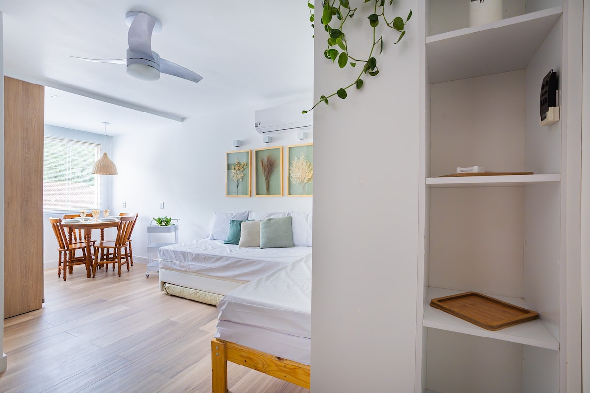 Fully furnished studio apartment, exclusive use and very cozy, with full kitchen, bathroom, Wi-Fi Internet, SmartTv, air-conditioning, fan, shower with hot water, a double bed and single box bed with auxiliary, mountain view. In one of the most sought-after regions of Costa Verde! Privileged location: on the second floor of a building with access (street) through the street of Garatucaia beach and second direct access on the beach sand Includes parking space for 1 car.