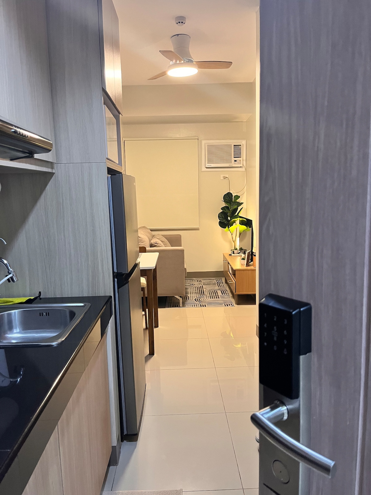 Unwind in our minimalist haven designed with warm wood tones, white accents, and soft lighting. Capture the essence of your stay with the large mirror, perfect for capturing the ambiance of the space. Gaze out at the city lightscape as you cuddle up for a cozy night in. Prepare a romantic meal in our fully-equipped kitchen. Located near Sta. Lucia East Grand Mall, this unit offers a blend of tranquility and city access – ideal for couples seeking a romantic getaway.