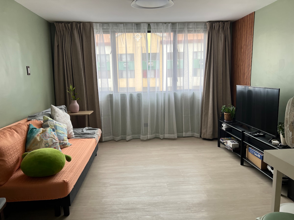 Situated on the 3rd floor of an apartment building, enjoy your stay here with your friends and dine outside the patio! What we have: -AC -Unlimited WIFI -Bingewatch all night as we have NETFLIX -Kitchen with single Induction stove + complete utensils -Refrigerator What we don't have: -Water heater -Projector (the one in the photo) is owned by the previous tenant -Parking area (but there's limited street parking for motors)