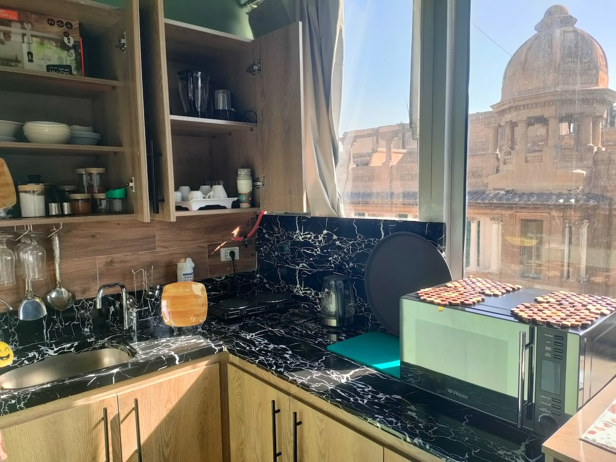 Enjoy a chic retreat in the heart of Cairo! This cozy one-bedroom apartment is just a 5-minute walk from the Egyptian Museum and metro lines. Features include a comfortable bedroom, stylish living area with sofa bed, private balcony, and a well-equipped kitchen. Breakfast and laundry services available for an extra cost. Quiet, secure building with elevator access for a peaceful stay.