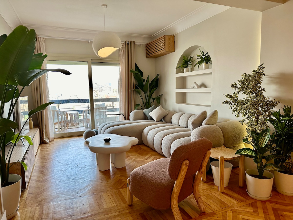 Welcome to our Nileview loft, Your charming home in the heart of Zamalek Island, Cairo's most central, safe, and vibrant hub. The stylish living room boasts a 55-inch curved smart TV and panoramic views on the Nile. A boho living room with a bamboo swing overlooks a gorgeous Nile view. Two cozy bedrooms featuring memory foam mattresses, hotel-grade Egyptian cotton beddings. Relax in comfort and style with a touch of bohemian charm by the Nile."