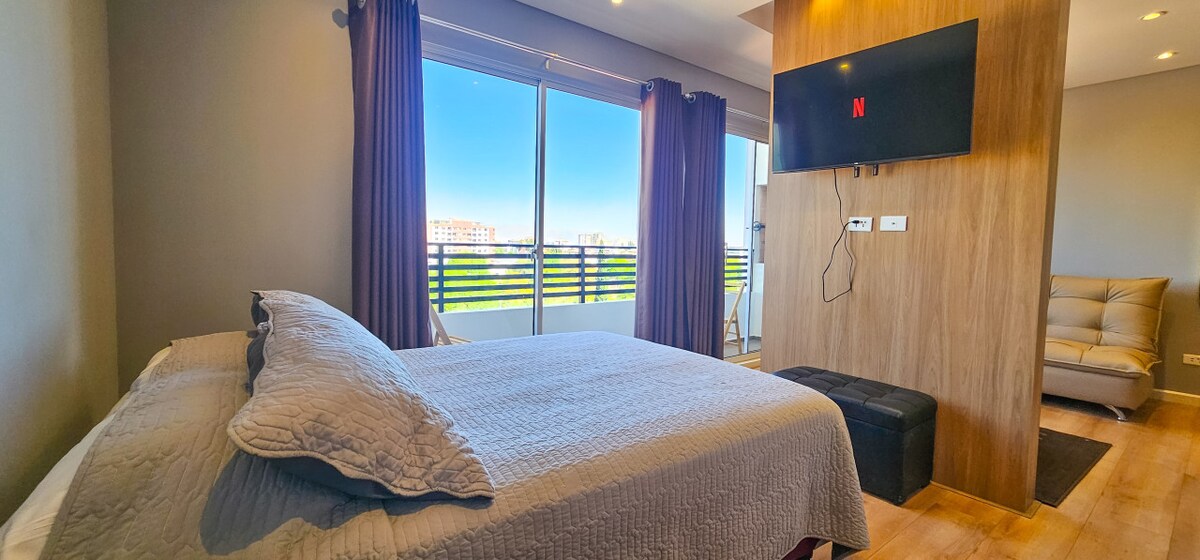 Have a unique and relaxing experience in this luxurious, quiet and elegant space, with a balcony overlooking the best park in the city, with environments designed for your enjoyment and comfort, independent check-in and free parking on the premises. Privileged location with access to banks, shopping, supermarkets, bike paths, restaurants with delicious food, and cozy cafes. Strolling through the park will fill your days with calm and give you wonderful moments of relaxation.