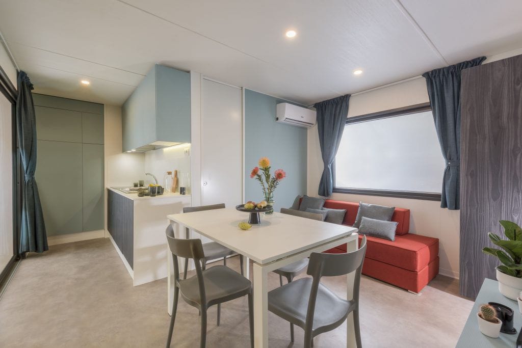 Deluxe ti attende all’ombra dei nostri secolari pini per vivere una vacanza a contatto con la natura senza rinunciare al massimo comfort. è composta da una veranda privata dotata di ampie porte vetrate, il soggiorno con angolo cottura dallo stile minimale, una camera da letto matrimoniale, una seconda camera con due letti singoli ed un terzo letto estraibile, ed in fine due bagni completi. Attenzione: le immagini sono al solo scopo illustrativo e non rappresentano il design finale.