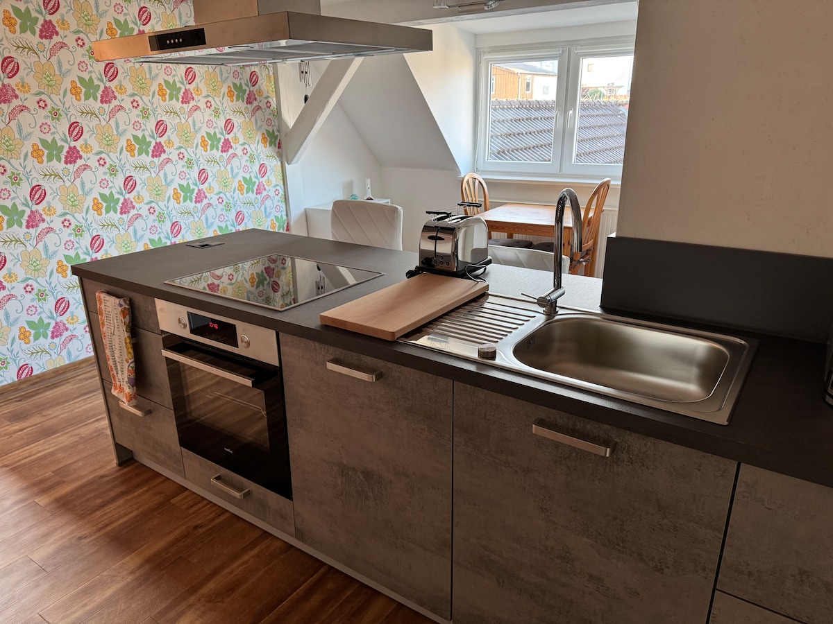 Individually furnished holiday apartment on the ground floor of our beautiful half-timbered house. Double room, large single room, a small but cozy single room next to the kitchen and a small dining room. The kitchen is fully equipped with dishwasher and fridge/freezer. We live on the 1st floor and are always available if you have any questions or problems. The garden can be shared. 7 min. walk to Ahnatal-Weimar train station.