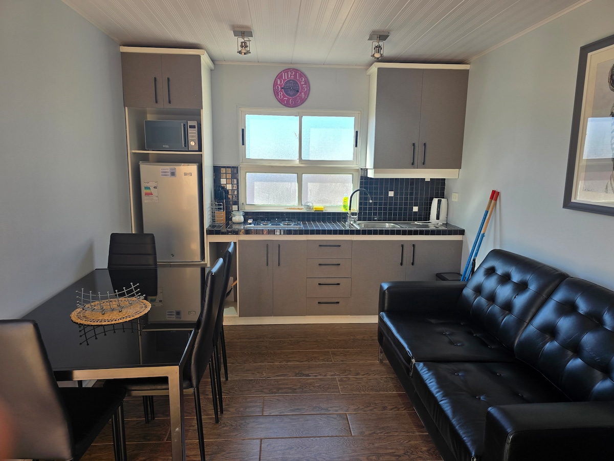 Beautiful and comfortable interior apartment type independent cabin, equipped for 1 to 4 people, with two bedrooms, each with a double bed and a futon in the living room. It is totally private, with bathroom, equipped kitchen, living/dining room. It does not have private parking. This cabin is one block from Plaza de Armas, Playa Mansa, its location and security make it an excellent option for families, easy transportation to Bahía Inglesa