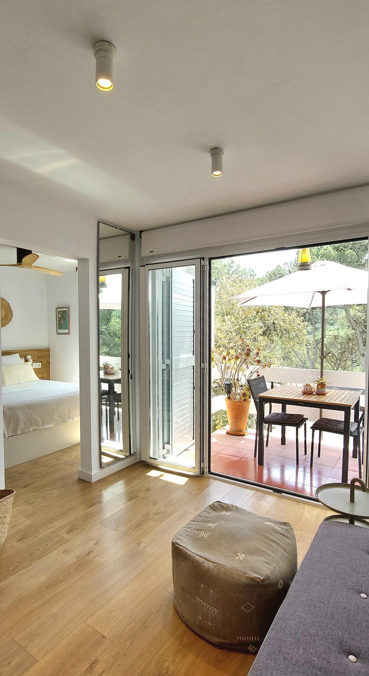 Mas Prats becomes a quiet corner, which invites you to rest and enjoy a unique rural environment located between the Costa Brava and the Gavarres. The one-story house is accessible, spacious and very bright and from every room you can see the fields or the forest. The birds are listening. Two large windows connect the house to the outside, where the porch invites you to enjoy the landscape. The decoration is minimalist and they dominate the clear tones and the wood. An ideal choice for any time of the year.
