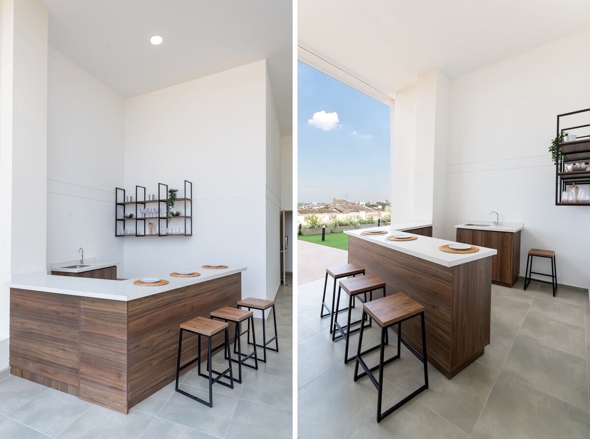 Spectacular apartment in one of the best neighborhoods in Cali with a panoramic view of Cristo Rey, very bright - Free luggage storage service Very comfortable room with a queen bed, a spacious balcony with an living room, a work space, a full kitchen, and a dining bar. The building has a coworking area, jacuzzis, a BBQ terrace, and an outdoor bar. Close to shopping centers, clinics, a dog park, the Granada neighborhood, El Peñón, and the Pascual Guerrero stadium, El perro park and much more!