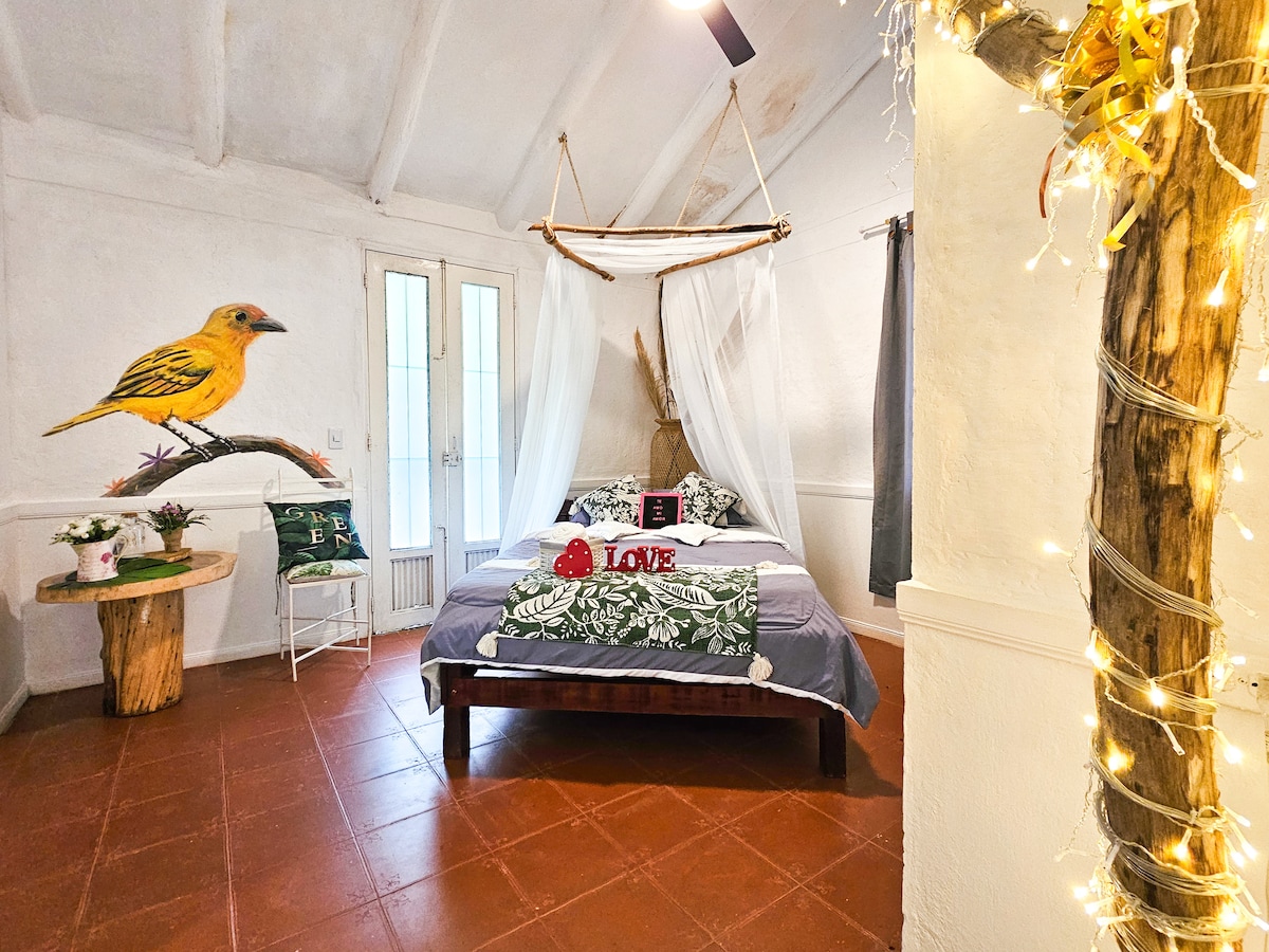 Despierta con el canto de los pájaros en esta hermosa cabaña rodeada de bosque, a solo 300 metros del río Pance. Un refugio perfecto para quienes buscan desconectarse del ritmo urbano y reconectarse con la naturaleza. La habitación combina el encanto del campo colombiano con detalles románticos y artesanales: Cada rincón está pensado para inspirar descanso y conexión con la vida rural. Afuera encontrarás una gran piscina rodeada de palmas, senderos verdes y espacios para descansar o compartir.