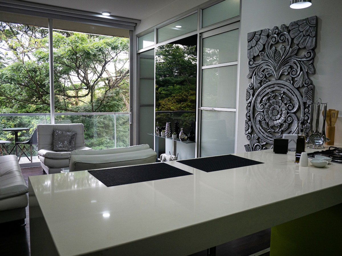 Loft apartment on the 7th floor with an incredible balcony and garden view. It consists of a bedroom with a high-quality king-size bed, a private bathroom and dressing room, fully equipped with air conditioning, 300mb wifi, a safe, and a smart TV with a Netflix subscription and several TV channels. A kitchen with its implements. The Hayedo de Juanambu building has a reception with 24/7 private security, elevators, covered parking, a nice social area, gym, Turkish bath, coworking, and a swimming pool on the 9th floor.