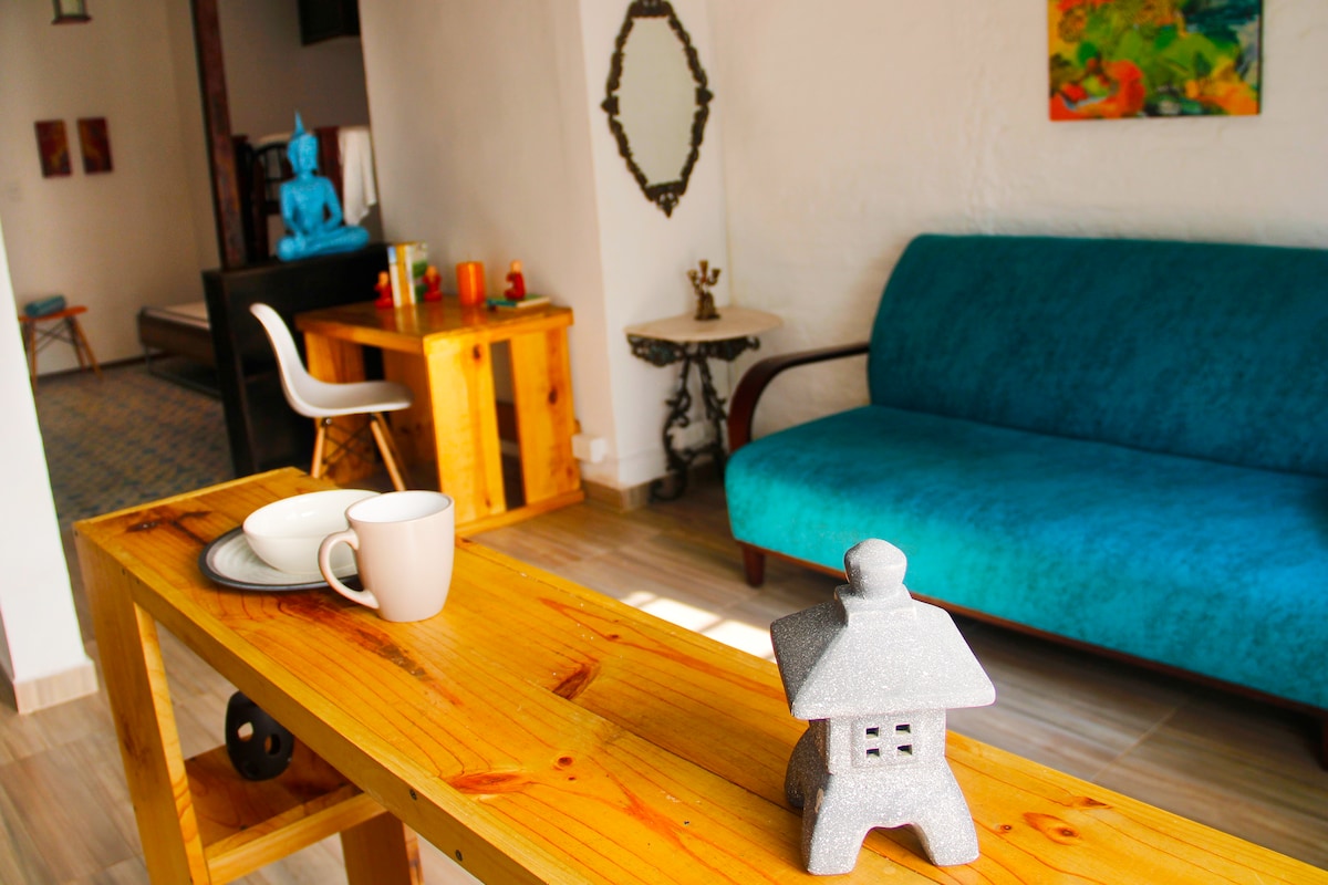 Stay from 2 nights to months by giving yourself wellness and rest in a unique place in Cali, while you take care of the environment with us! Disconnect from your worries, treat yourself to peace and rest at this spacious and pleasant vintage-style home. We are located in an eco hotel and wellnes center within the city, but full of nature, where you will be able to access, with an extra payment, yoga and meditation experiences, and receive body treatments.