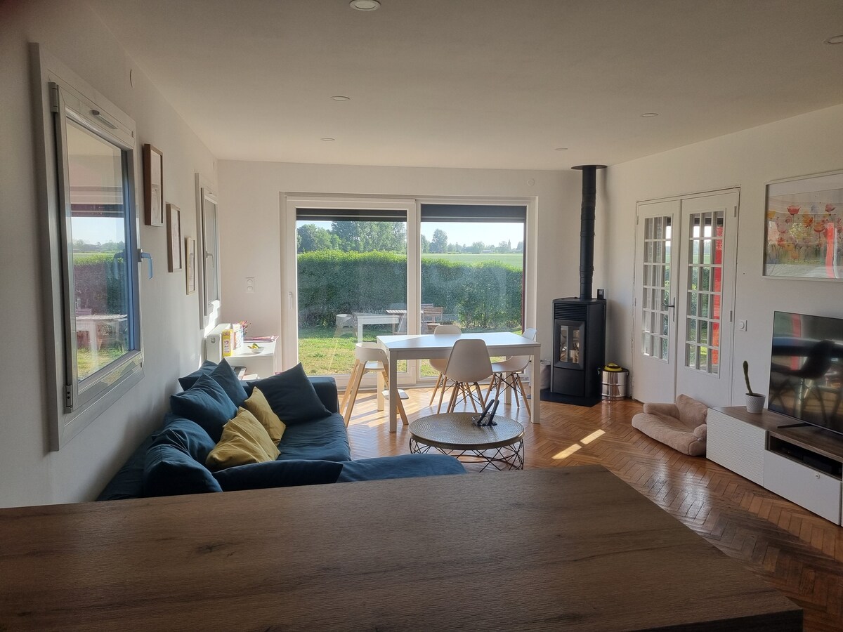 We hope to welcome you soon to our new apartment at "La Maison Rouge" located on the Lille/Dunkirk highway and SNCF line, near the train station and highway exit close to the village). - Independent apartment - Large terrace with panoramic countryside views - Wood-burning stove - Fully equipped kitchen + washer-dryer - Very carefully chosen 180/200 bedding to ensure maximum comfort - Ultra-fast fiber Wi-Fi, Apple and Orange TV - Many shops within walking distance