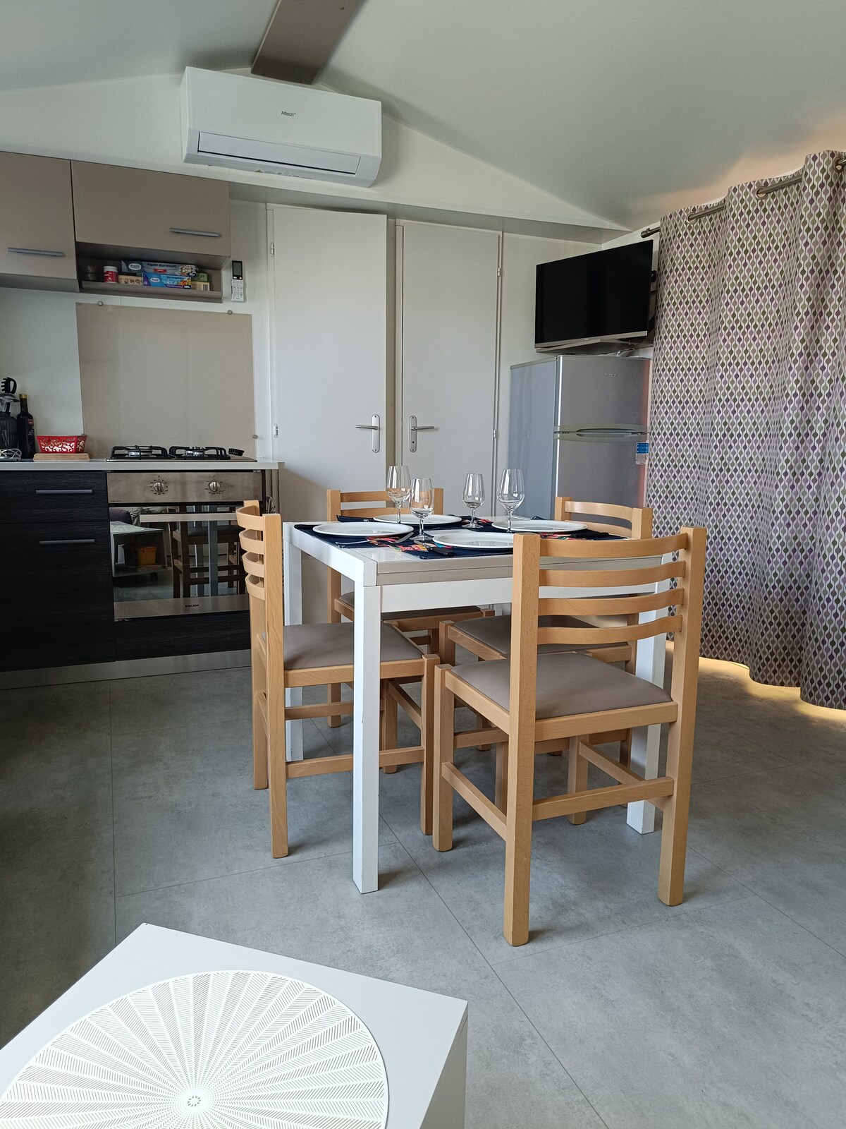 Air-conditioned mobile home with covered and equipped terrace. 2 bedrooms, 1 with 1 double bed, 1 with 3 single beds including 1 suspended for children up to 6/7 years old. 1 convertible space for 2 people in the living area. Sheets not provided! Bathroom. Separate toilet. Microwave, coffee maker, kettle, fridge-freezer. Electric barbecue. TV. Dogs (except cat 1, 2 or those that may pose a behavioral problem) and cats are accepted within the limit of one animal per stay. Rooms are forbidden for the animal, nor on blankets!!