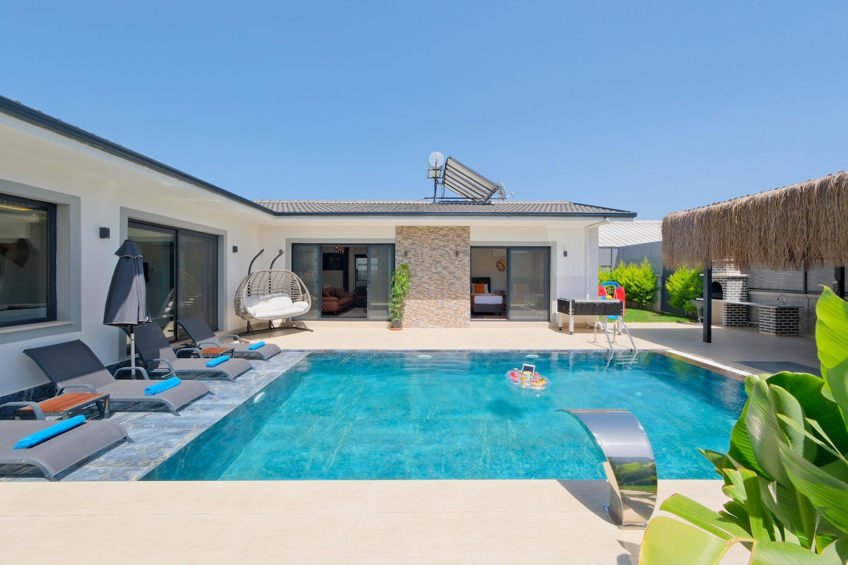 Our villa is a fully equipped villa located in the city center, easy access to everywhere, luxurious, in nature. Our villa has two bedrooms, a children's room, a dressing room, two bathrooms, a shared toilet, a laundry room, a kitchen, a living room, a botanical garden in the house, a barbecue and a dining area outside the house, a 50 square meter pool. Our villa is 1 km to the beach, 3 km to the nearest beach and 2 km to the city center.