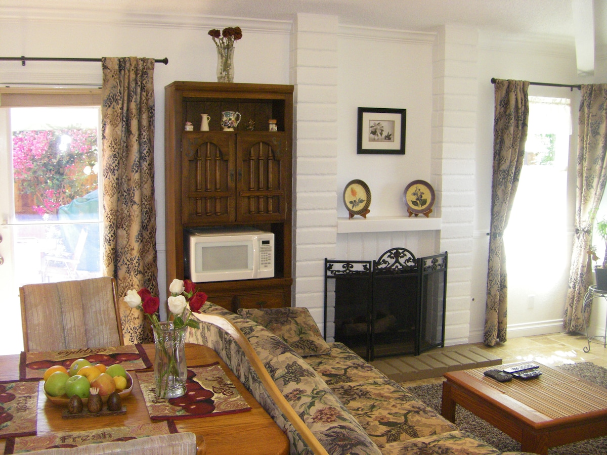 Luxury private apartment for two or more. Peaceful and centrally-located, this vintage flat has all the charm of family heritage with newly renovated amenities. TV- Free. Bike Trail and Camp Pendleton nearby. Beach is 20 minutes away. One very large bedroom with queen bed and full sofa bed. Adorable pink kitchenette and full private bathroom. Small table for eating/working. Private Entrance. Only shared space is backyard. Free Parking.
