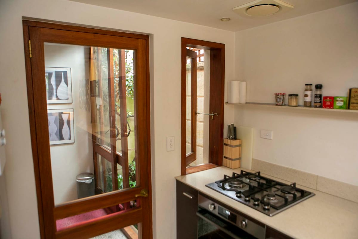 A loved, petite home with modern style. One bedroom with queen bed, quality linen & built ins. The living room has all your entertainment needs TV, DVD, SONOS & record player plus a built-in work space with a view to the garden. Newly renovated kitchen has all you need to cook and entertain with an adjacent indoor dining area. Large glass doors open out to a deck for outdoor living with herb garden and outdoor bath. Parking and charging for electric vehicles available on request at add cost.
