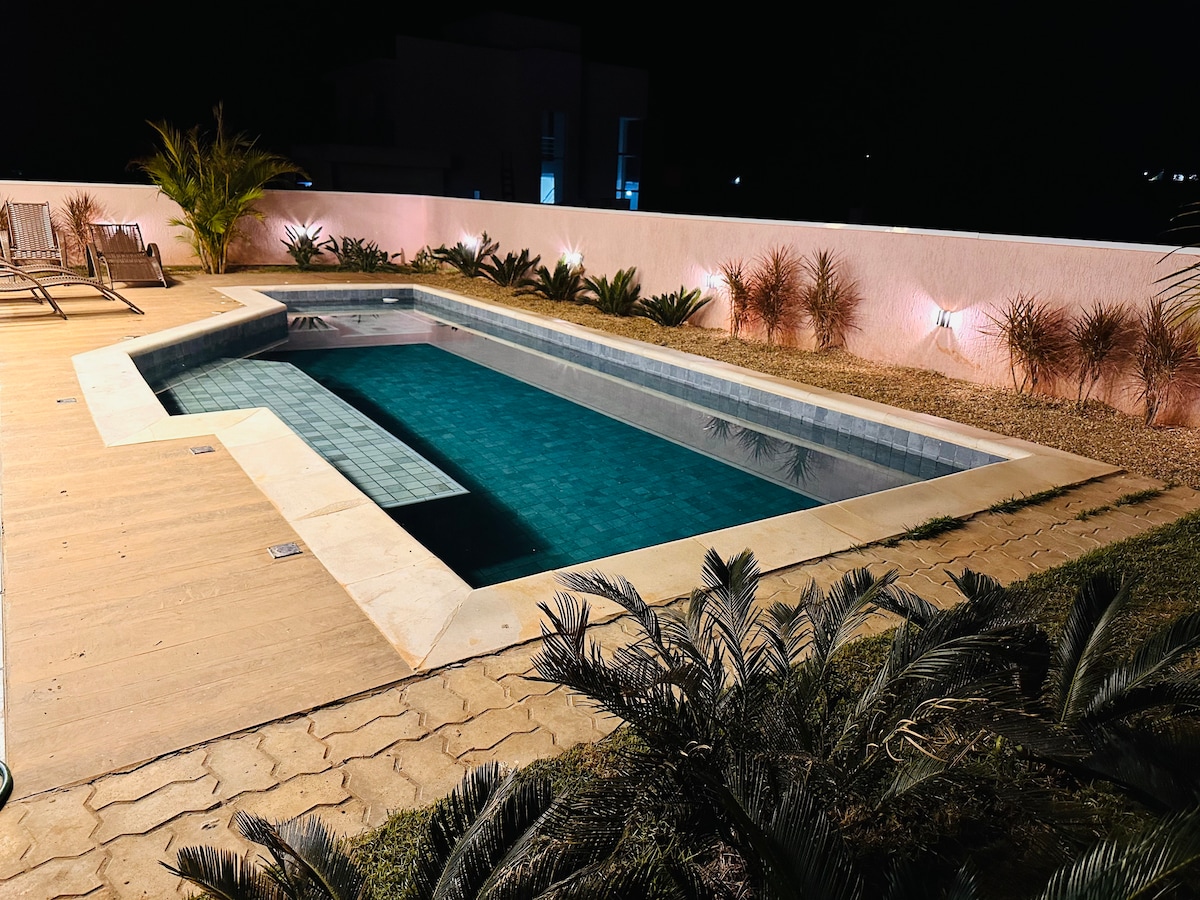 Casa nova, linda e decorada, piscina suspensa (mais segurança para crianças e pets). Em condomínio com segurança 24h. A área conta com 3 quartos, 3 banheiros , 1 cozinha completa, 1 sala, área gourmet equipada com utensílios, 3 TVs (com aplicativos para séries e filmes), eletrodomésticos, lavanderia e um quintal espaçoso com 3 redes disponíveis para relaxar. Todos os quartos possuem ar-condicionado.
