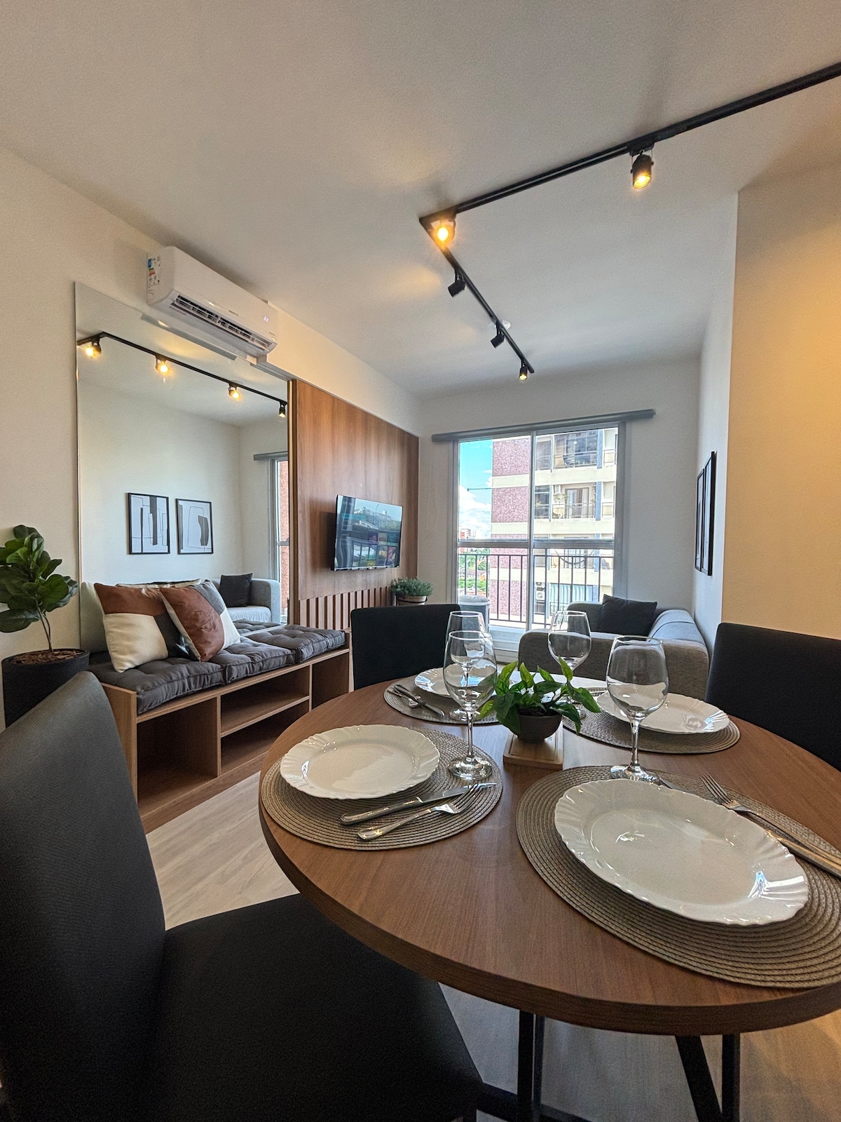 “A space designed for those who love the city but want a quiet retreat at the end of the day. Natural light, panoramic views and a cozy atmosphere in the heart of Campinas. Ideal for those seeking comfort, practicality and good energy.”