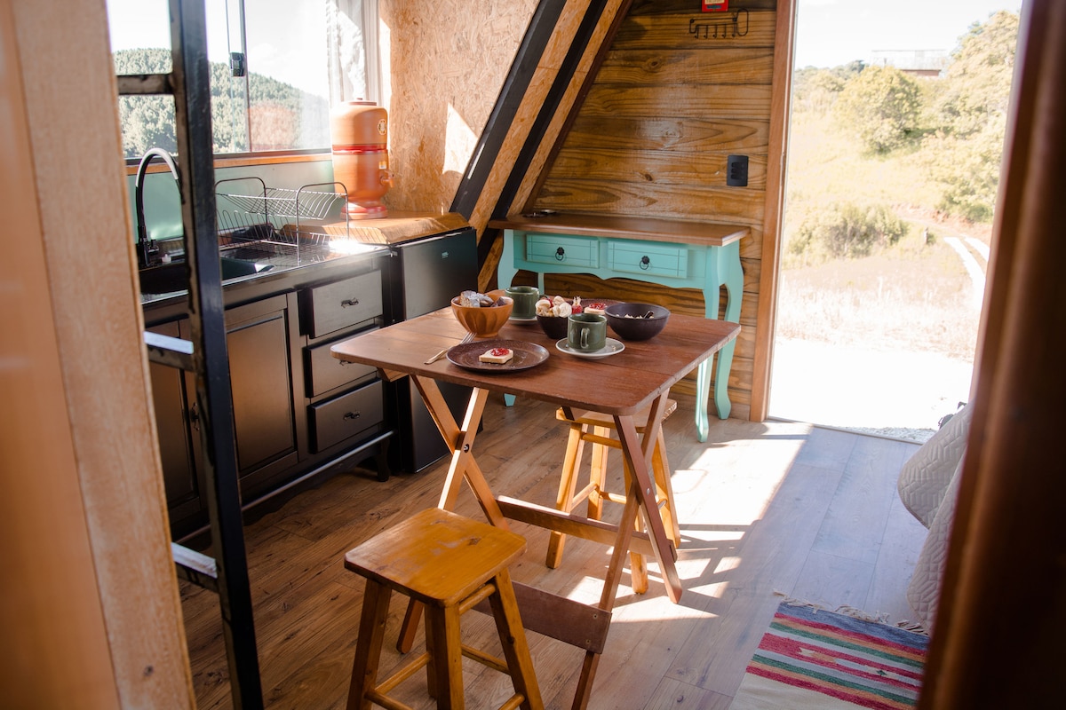 An A-frame cabin immersed in native forest and vineyards of a family of Italian origin. Designed to wake up to the sound of birds and sleep to the sound of water. The highlight is right at the entrance, the deck is over a waterfall. The kitchen is complete with high-quality utensils. The bathroom overlooks the forest, with a soaking tub and L'Occitane amenities. All rooms are decorated down to the smallest detail. Ideal for relaxing and getting into the right rhythm of life.