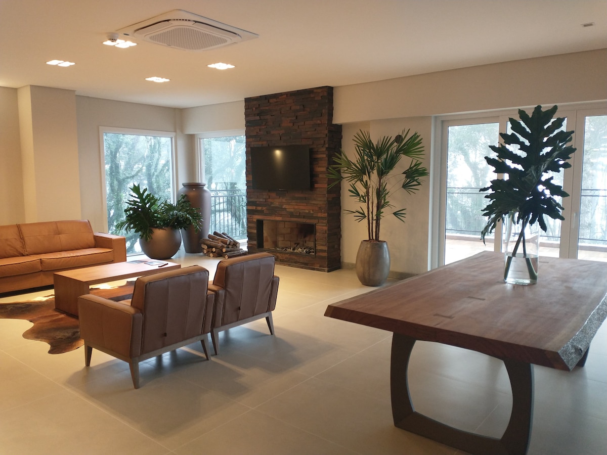 Beautiful Flat/En-suite for up to 5 people, with a double bedroom, living room with two areas with a dining table, sofa bed + aux bed, fireplace and full kitchen. The bathroom has a towel warmer and bathtub Bedroom and living room have a beautiful view of the araucaria forest. Ideal for relaxing with your family. Located in Cond Laje de Pedra with all the infrastructure available, a soccer field, tennis courts and an outdoor fitness center. Hotel service, daily cleaning, change of bed linens and kitchen