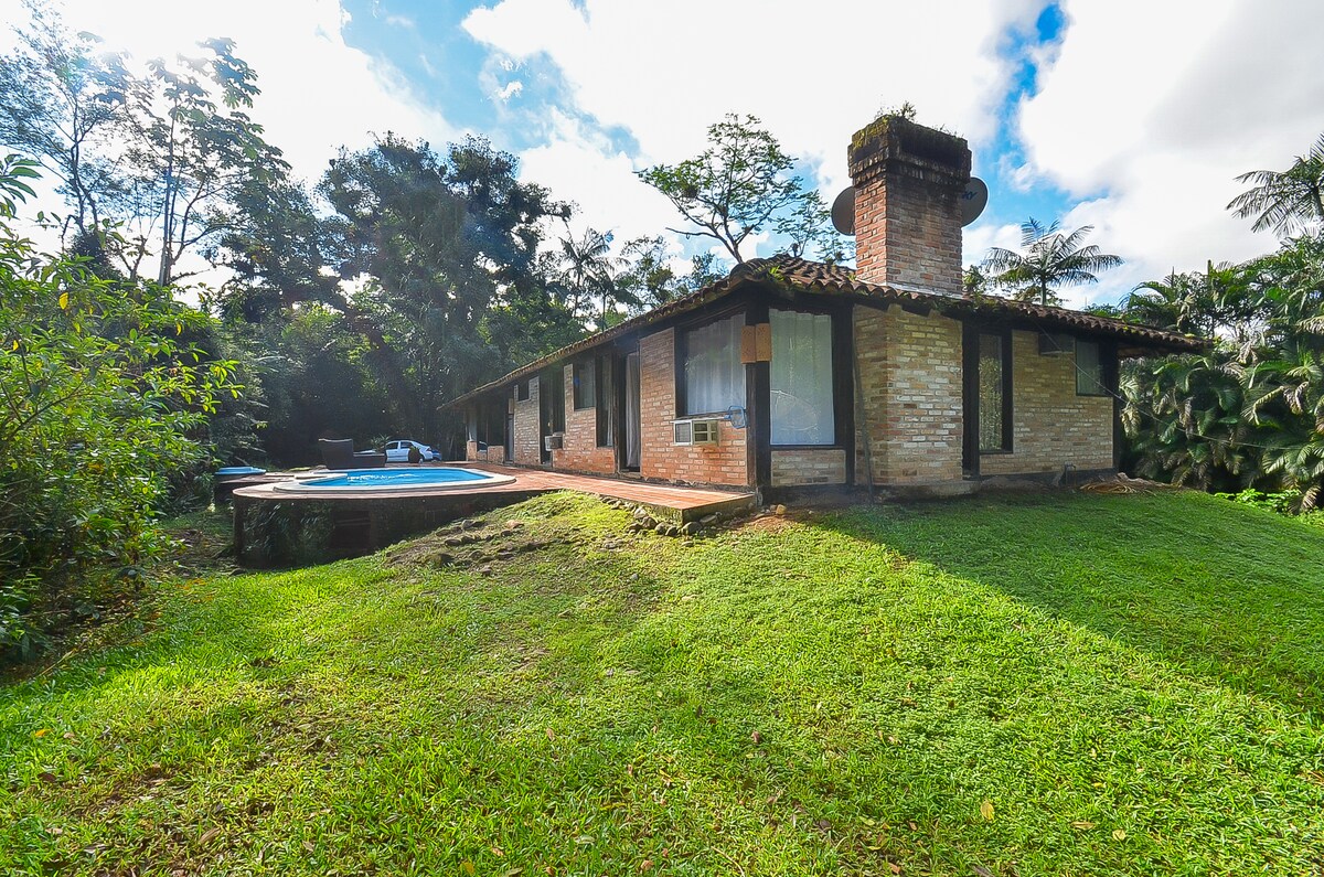 Mixed house, wood and masonry, natural water pool straight from the Serra.... gourmet area with barbecue... wood stove... With a beautiful view of the Serra do Mar. Simple but cozy clean house, fans in all rooms, very quiet place, easy access on the edge of the asphalt, now we also have a cozy corner for the cold winter days to warm a fire and eat a pinhao on the plate and roast corn on the grill. We also have smart TV.